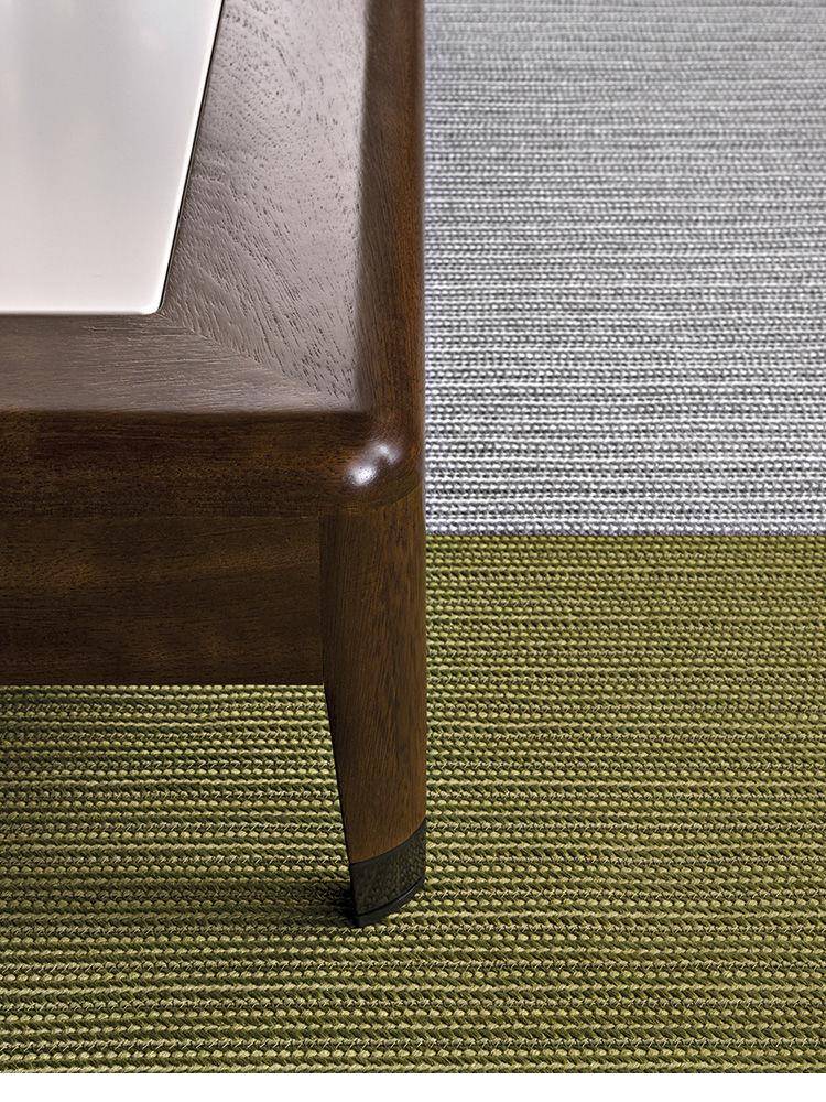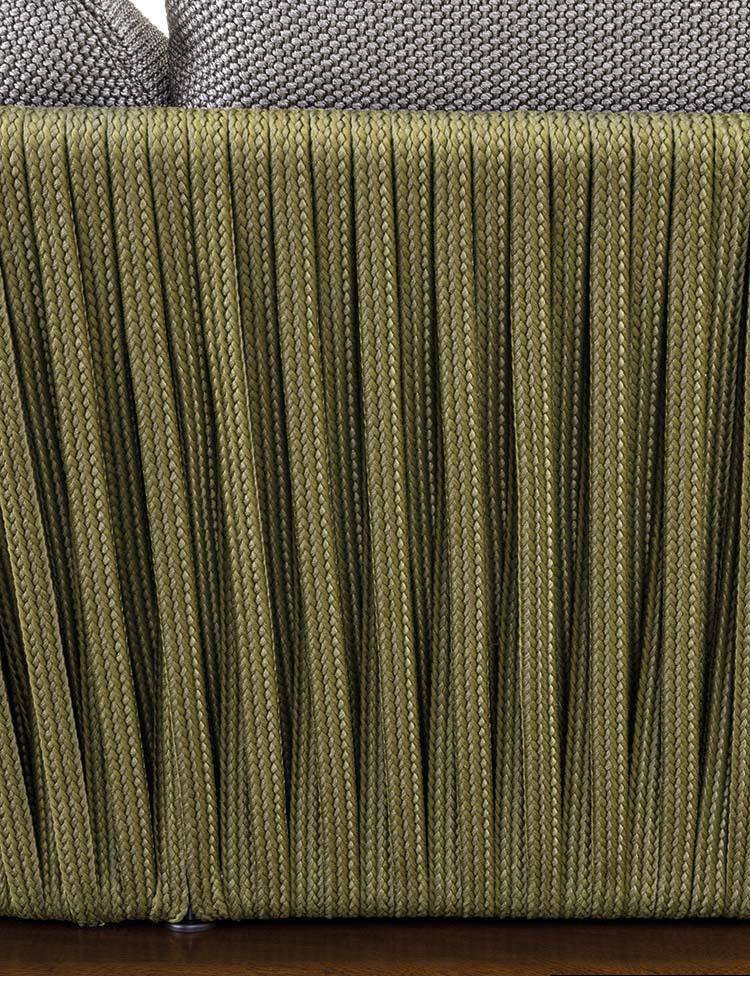 The elements are raised off the floor on Pewter color painted aluminum caps that are inserted into the wood base. The backrest and armrests are covered in a macro woven polypropylene webbing with a sleek, contemporary vibe and available in the following colors: Bamboo, Stone and Moka. The coffee table tops are in Corian® EC in the shade of Elegant Grey.