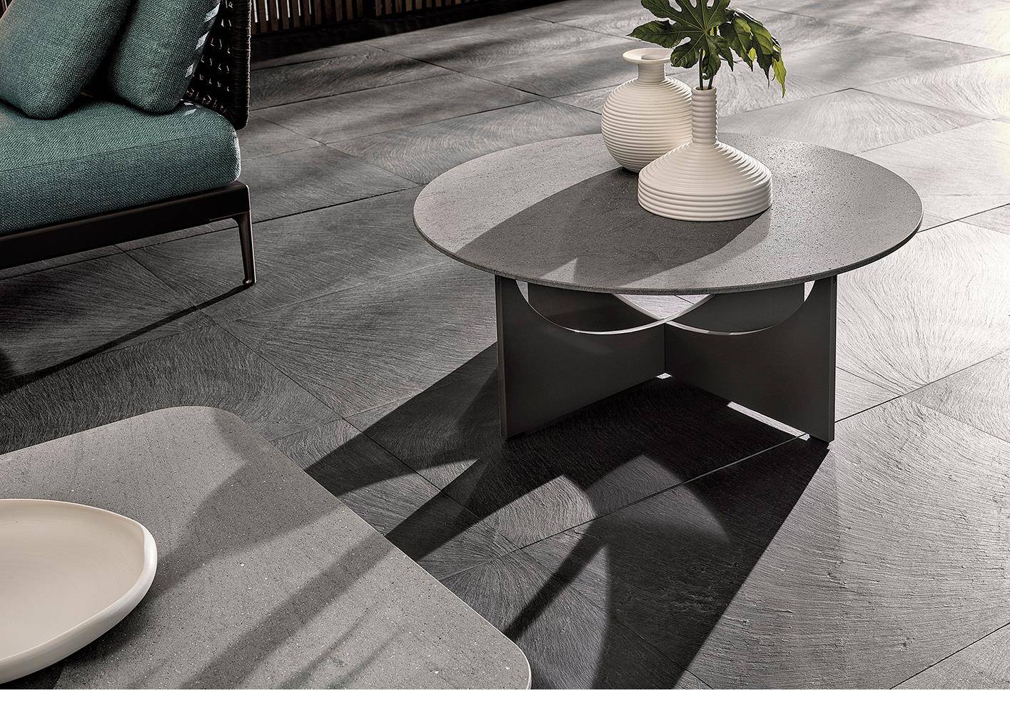 The coffee tables come in four sizes and two heights, with circular or square top in brushed, fine-grain Basaltina stone, which rests on the nest-shaped base.