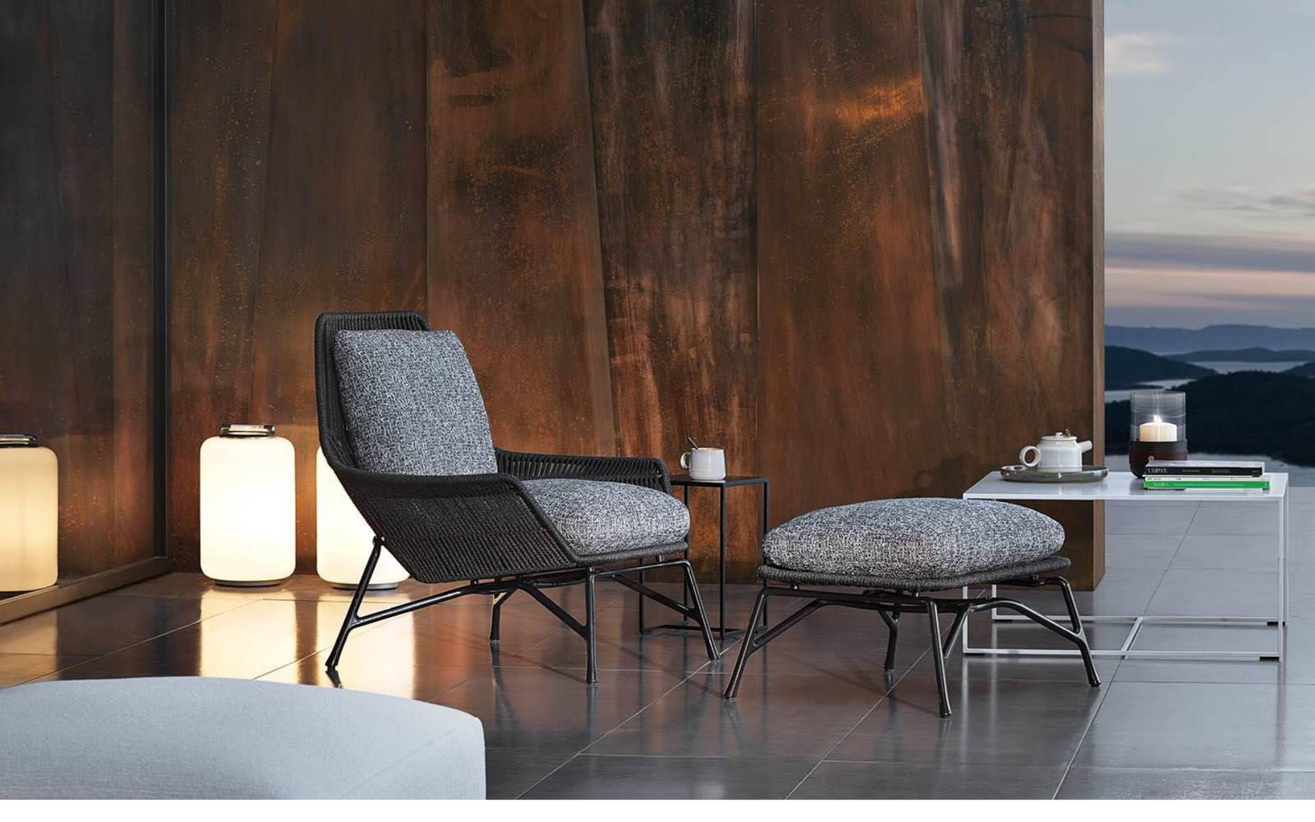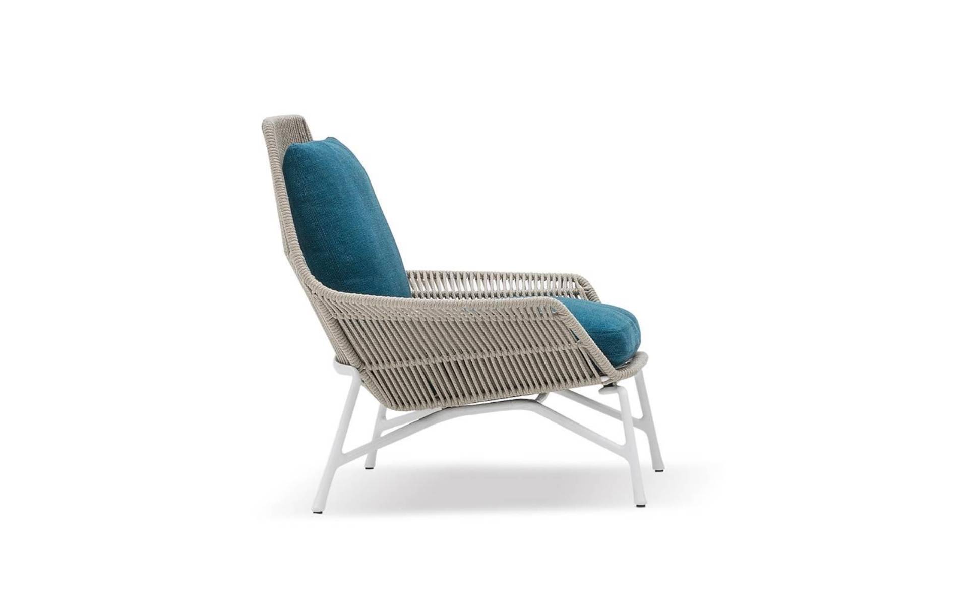 The fully removable backrest and seat cushions guarantee excellent comfort, while a footstool with the same finishes can be combined with the armchair.