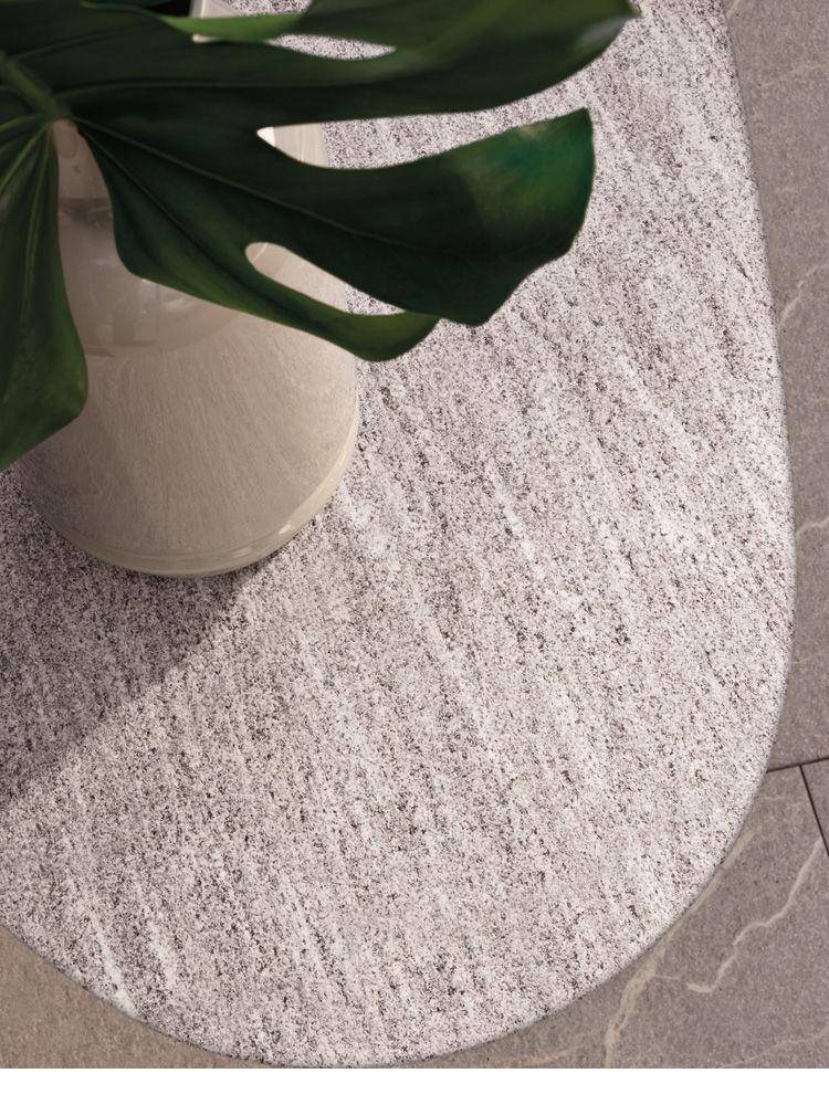 A coffee table with an elliptical shape with the top in Silver Beola stone with beveled edges, creating a visual and tactile effect similar to that of a river rock. The legs are in die-cast aluminium and are painted White with a bush hammered texture.