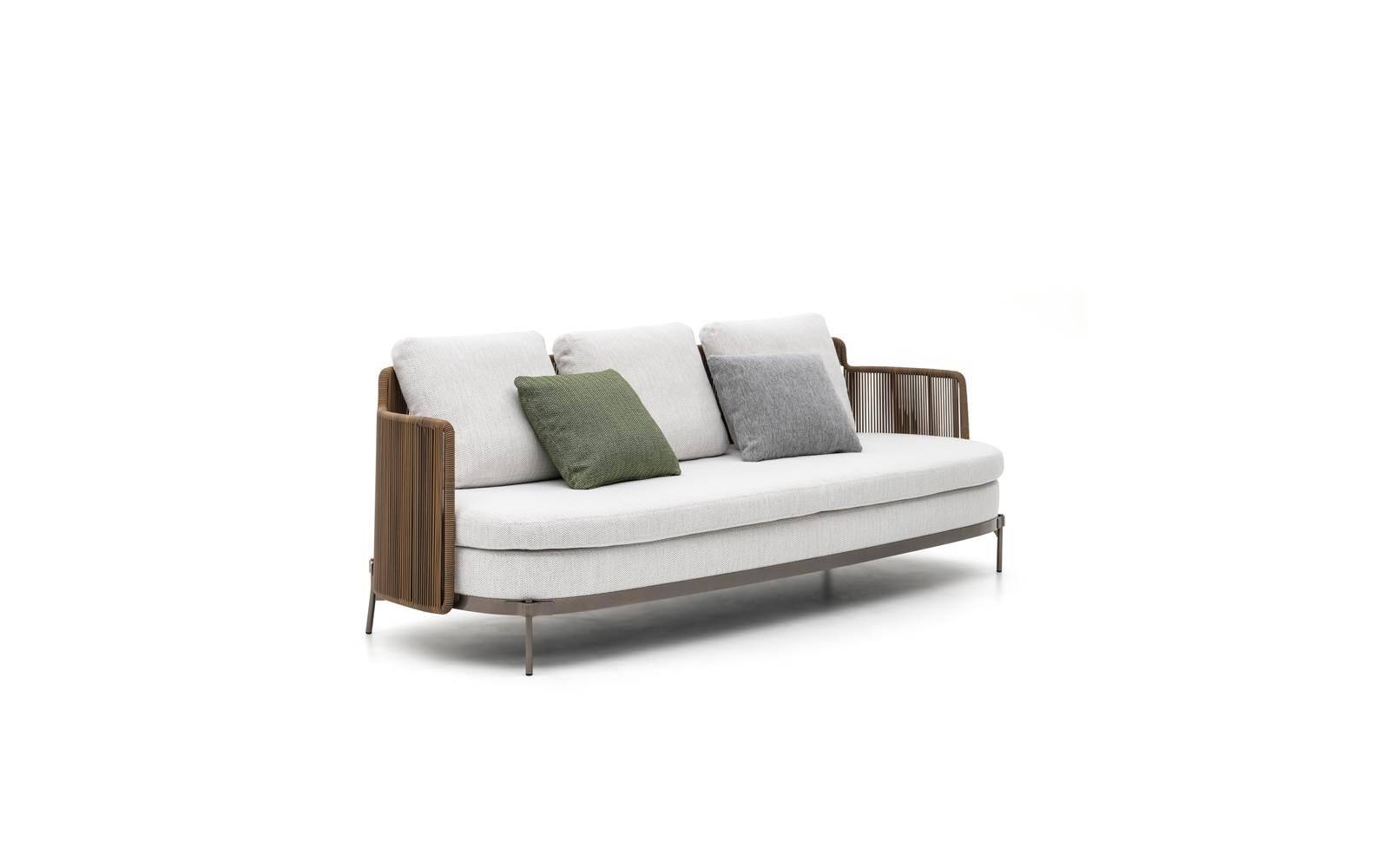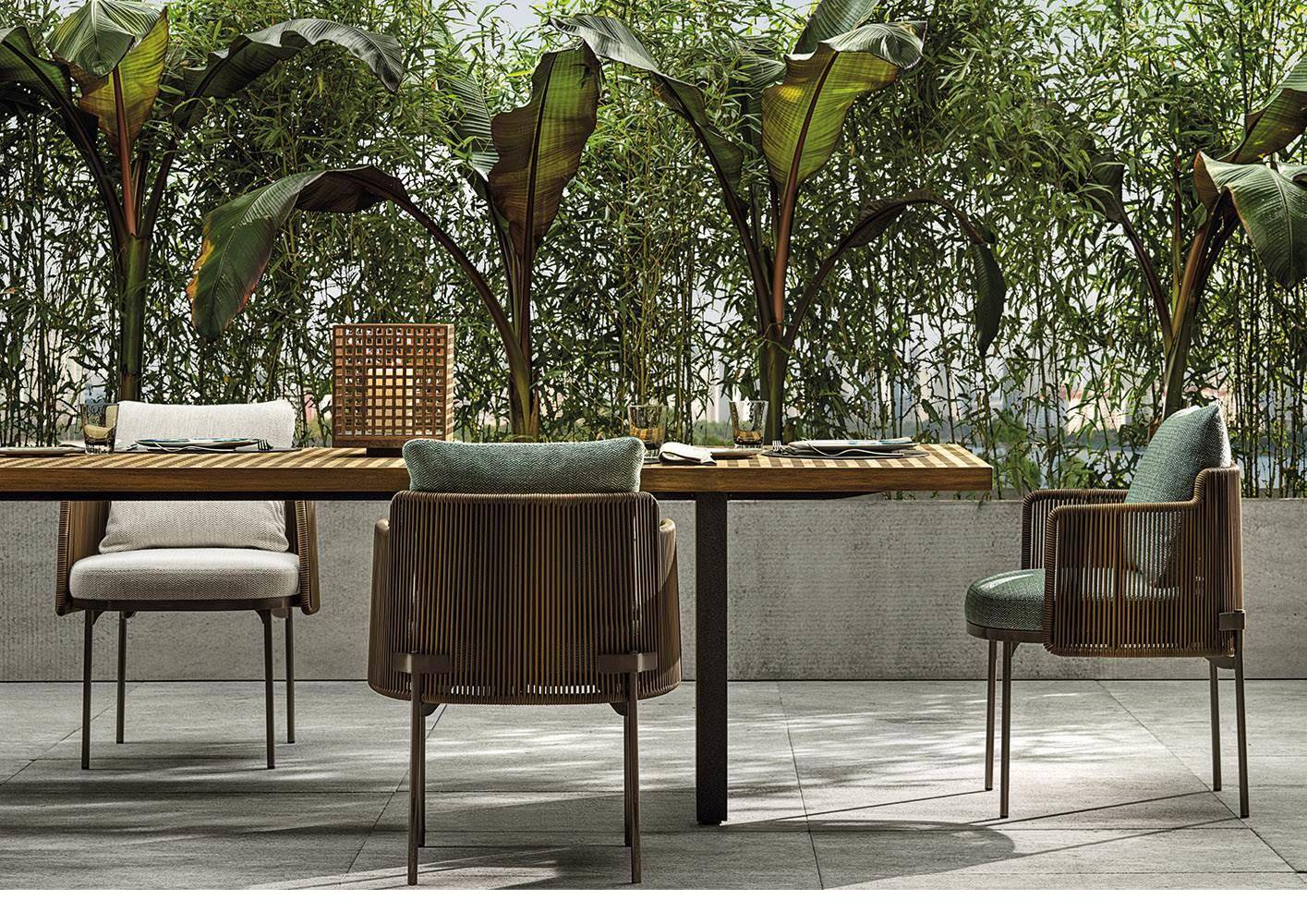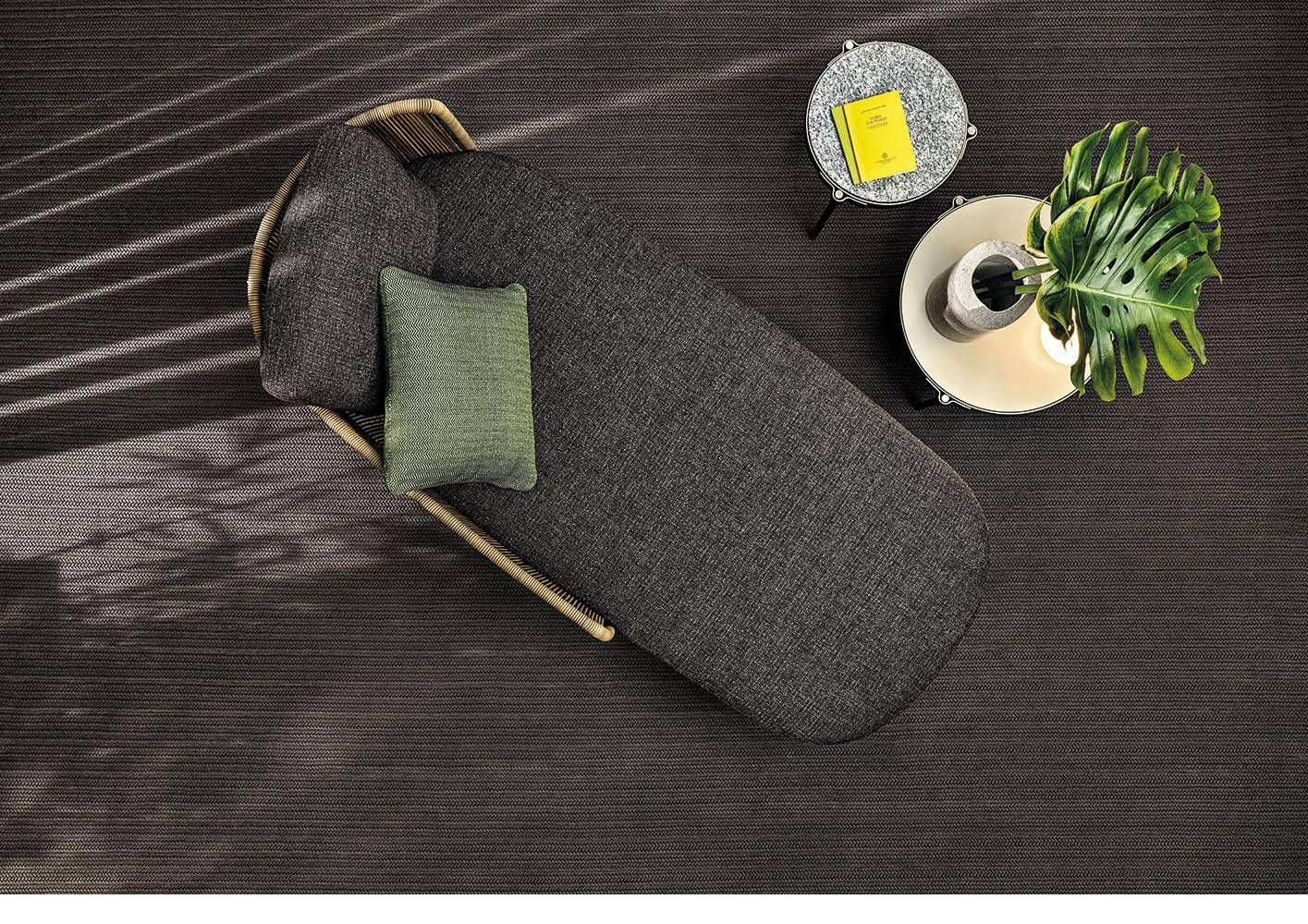 The seats become deeper, larger and more relaxing, while the metal frame, in a new outdoor finish, is covered with the wicker-effect cords available in two colours: Mud and Liquorice.