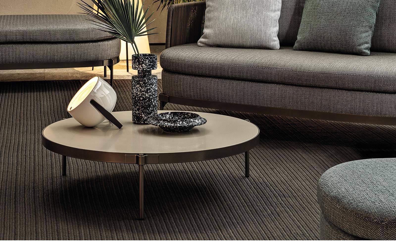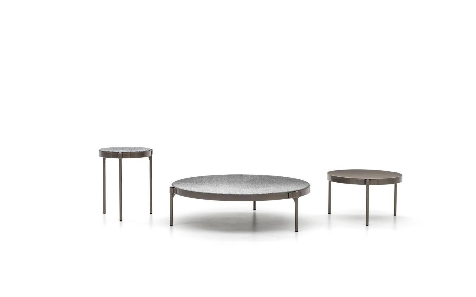 The concept of the small tables in metal with Bronze finish is inspired by the distinctive Tape detail itself, which aesthetically secures the legs to the crown, inside which the top in Silver Beola or Corian® EC is inserted.