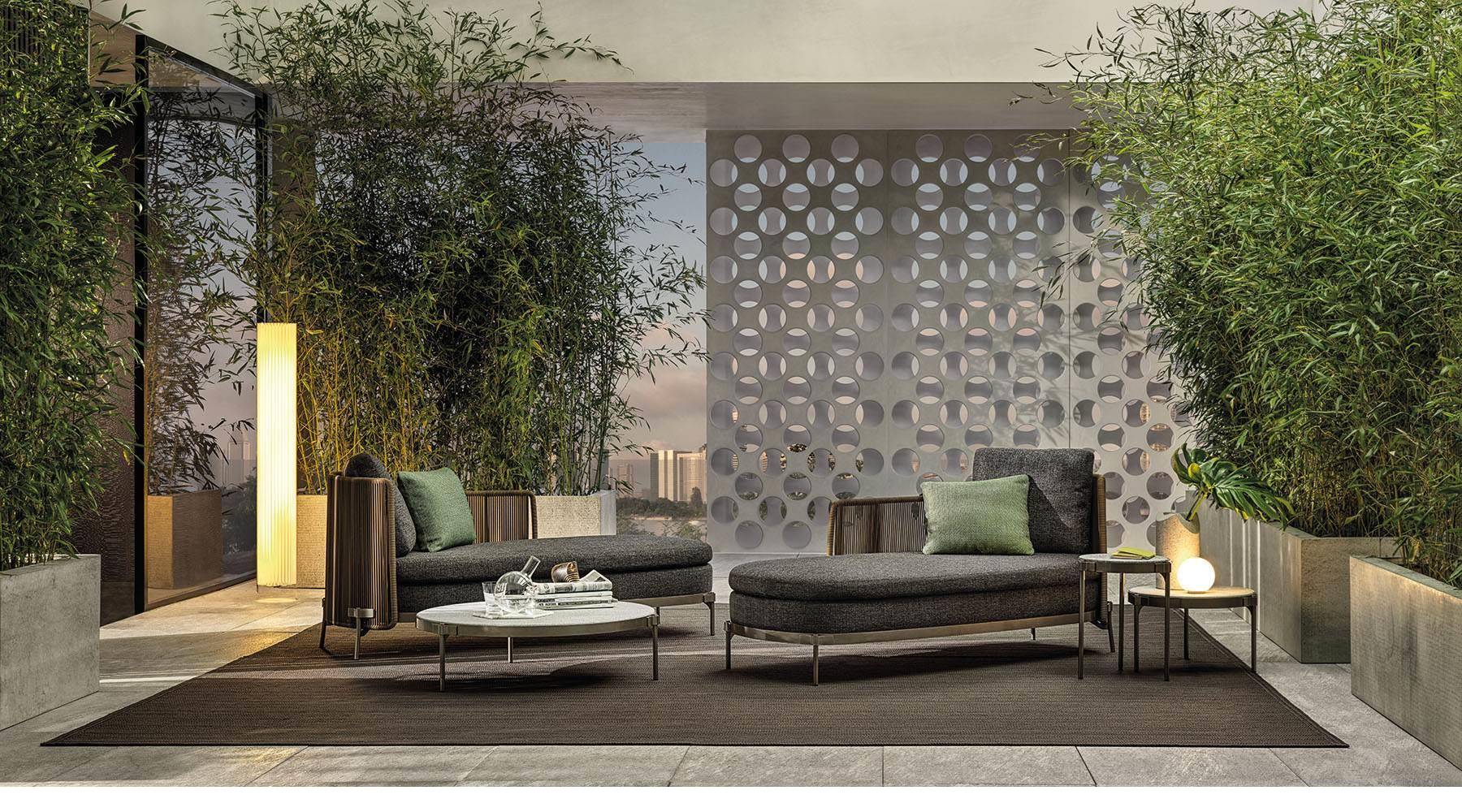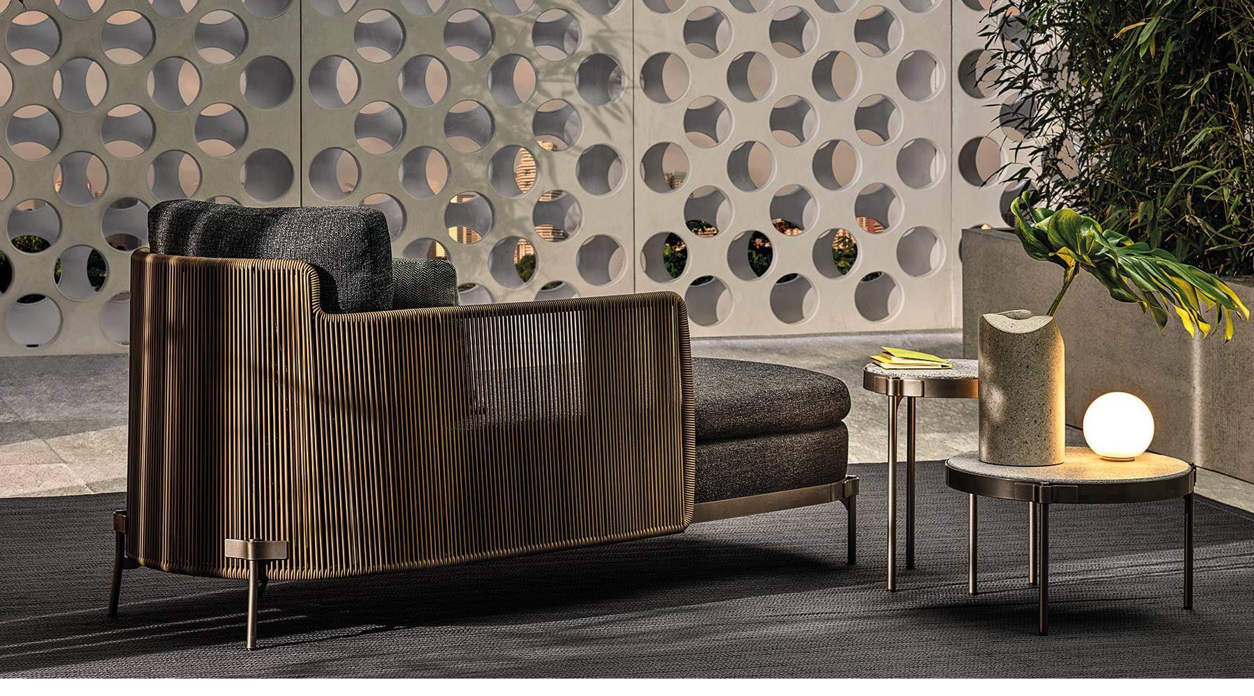 The system offers many elements, ideal for creating relaxation areas also in small outdoor spaces or on urban rooftop terraces: from the armchair to the sofa, from the Paolina chaise longue to the original couch open at the back, from the chair to the coffee tables, up until the stool in two heights of 102 and 115 cm, in the collection from January 2020.