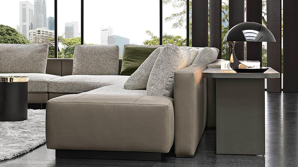 Daniels is available in two versions: all-fabric or all-leather, and in a third combined option with base and armrest in leather and cushion in fabric, flaunting a harmonious mix of the textures and colours of the exclusive Minotti textile collection.