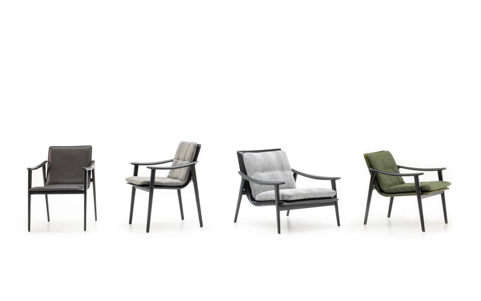 The Fynn armchair and little armchairs feature an ultra-lightweight aesthetic with a simple structure in ash wood with Liquorice colour stained finish. This hosts a padded seat and backrest cushion, designed as a single element. The informal rigour with which Fynn hosts the upholstered element designs a comfortable seat that almost cradles the body, wrapping it in the warmth of the wooden structure.