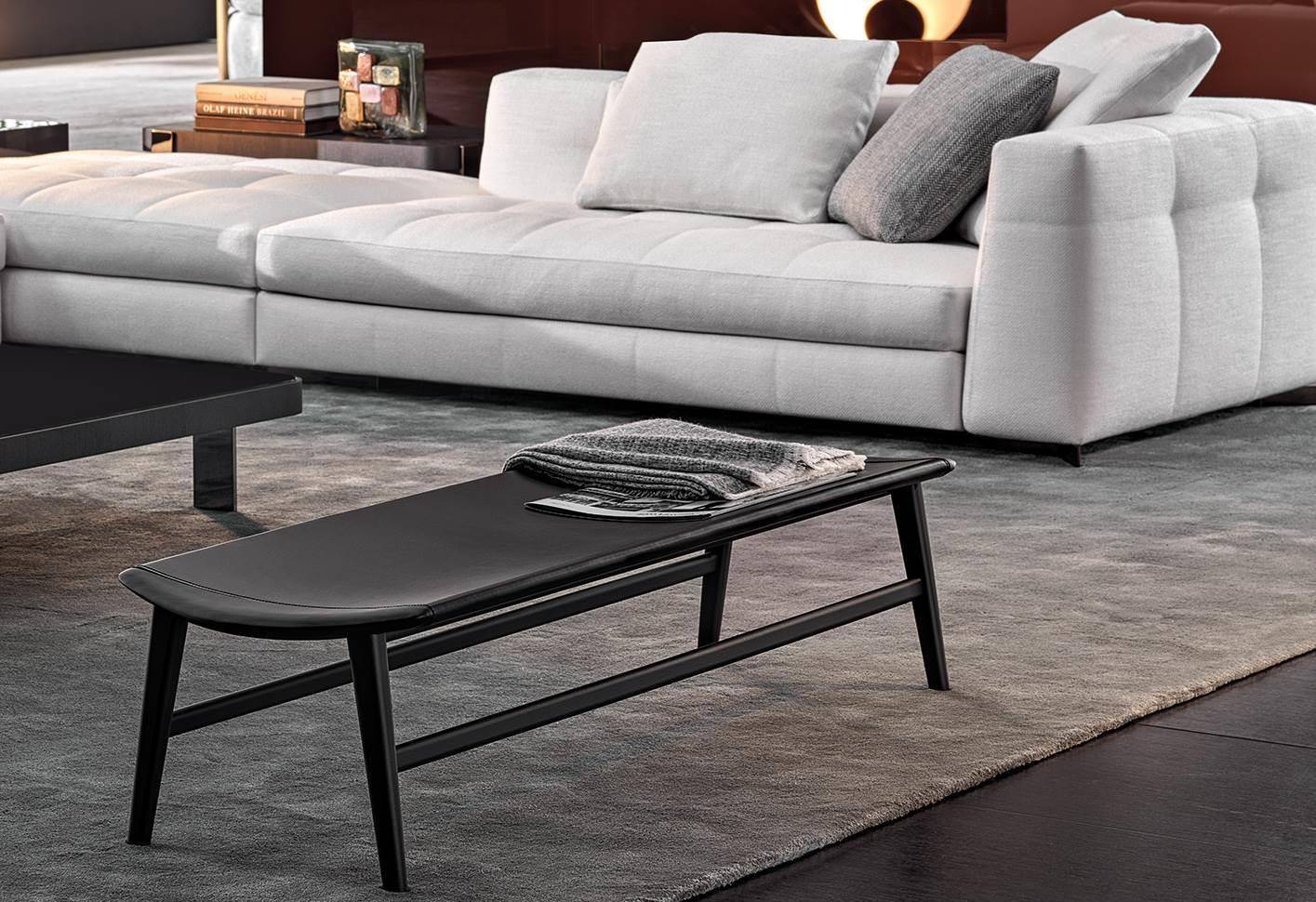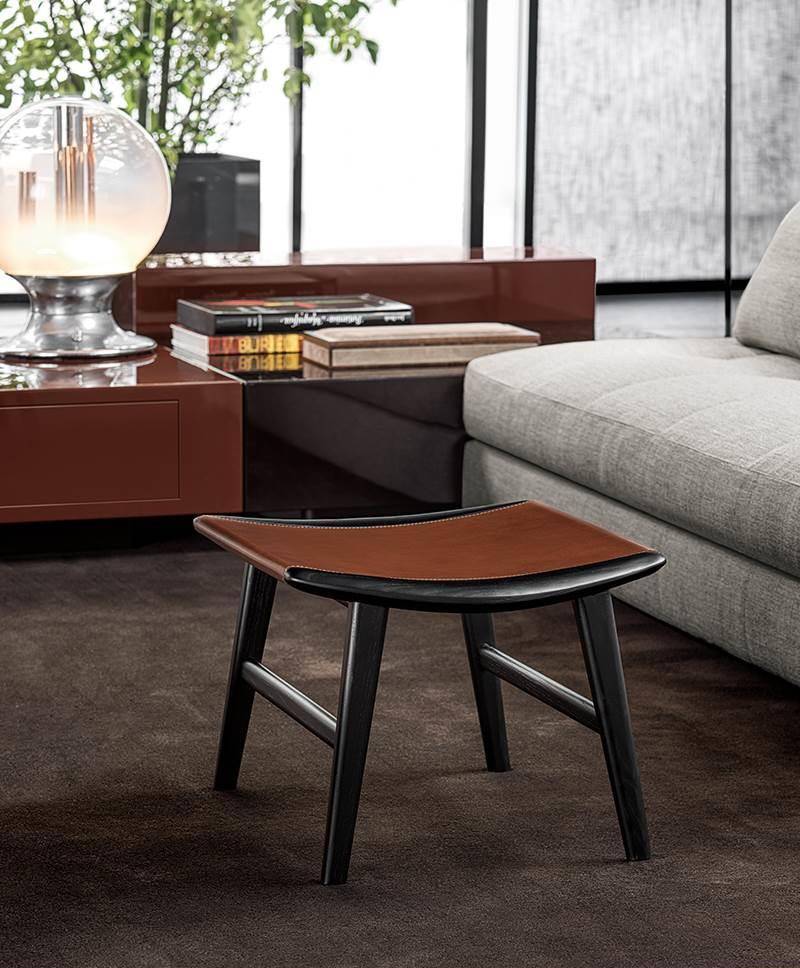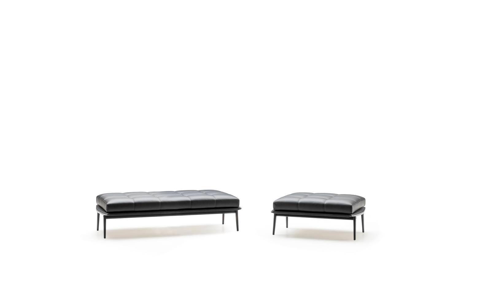 The Fynn family of seats is completed by a footstool and some benches of different sizes, all with a cushion except for the benches in the Saddle-Hide version, which have a structure with a slightly concave top, combined with a saddle-hide covering that envelopes it like exquisite leather.