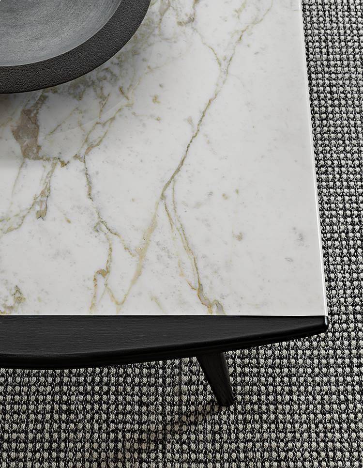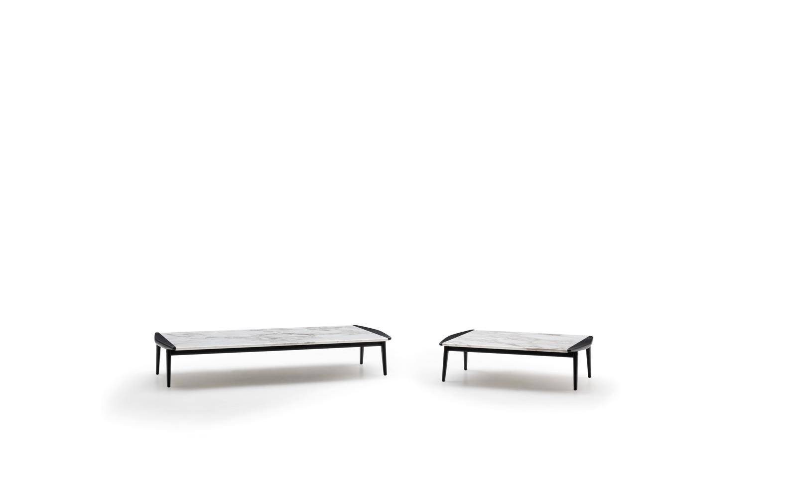 The coffee tables also share the same line as the wooden armrest, which designs a slight curve also found in the structural and side parts. The central part of the coffee table is enhanced by the presence of the top in Calacatta marble, creating a sophisticated combination of materials.