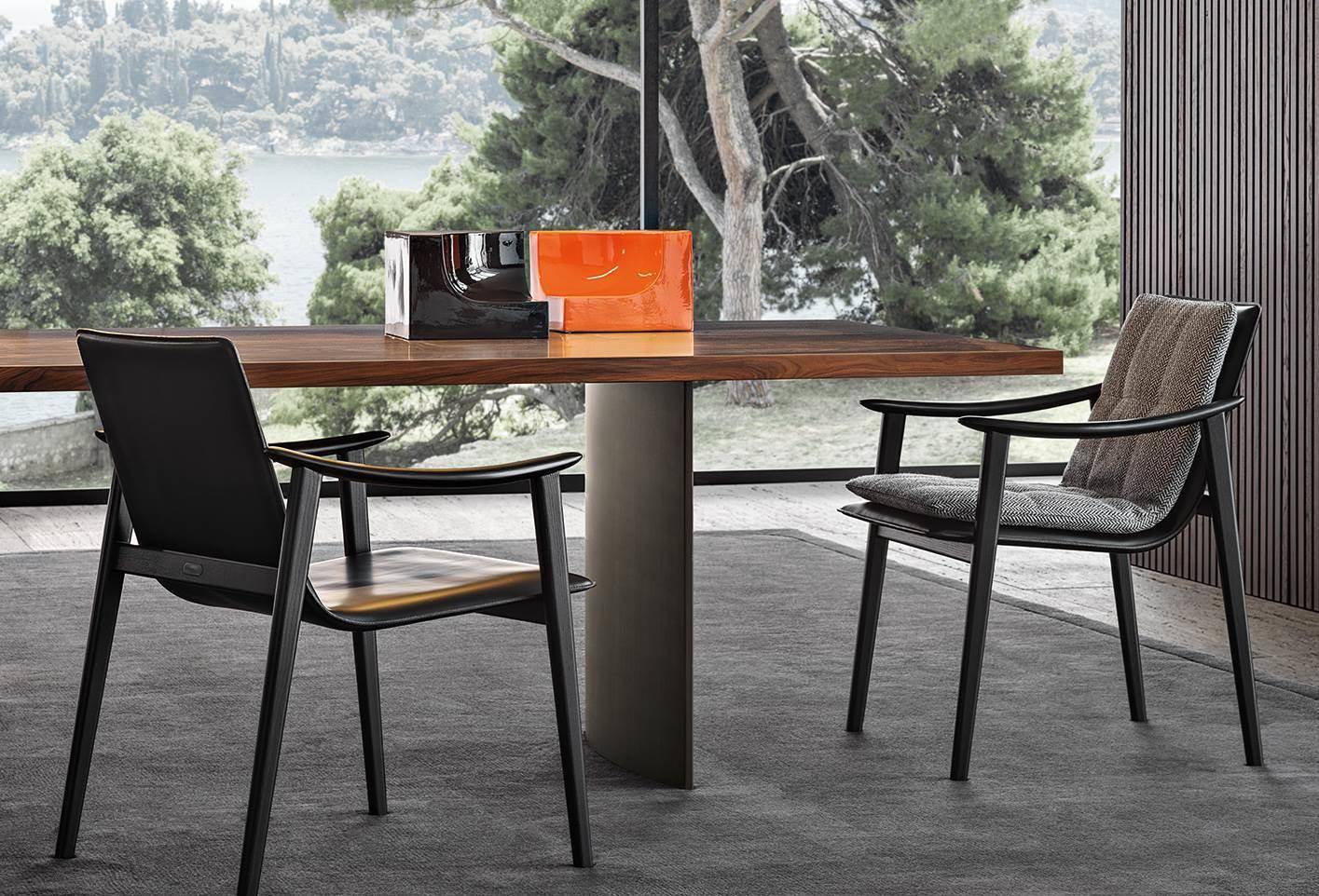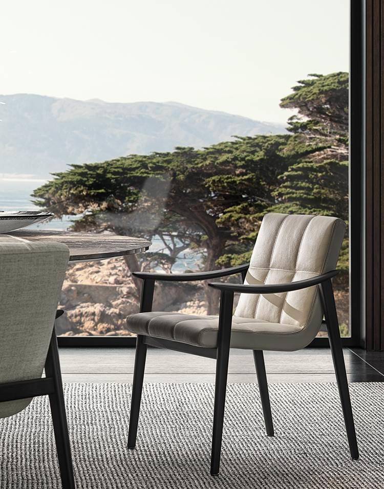 The Fynn conceived for the dining area includes the version with fully padded shell and, alternatively, the Saddle-Hide version with or without cushion.