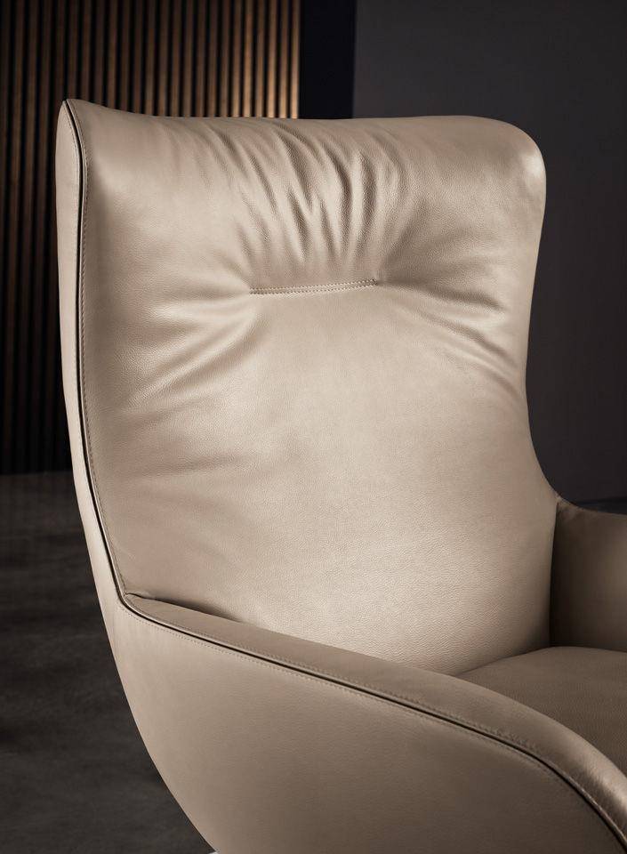 Technology, the master craftsmanship of Italian upholstering, design and comfort are all here. The frame of this contemporary wing-back chair ensures stability, while the goose down cushioning invites surrender to its softness. The caneté stitching around the perimeter of the body highlights Jensen’s design excellence, while the zipper (visible on the front of the seat cushion) adds a decorative, yet practical, note.