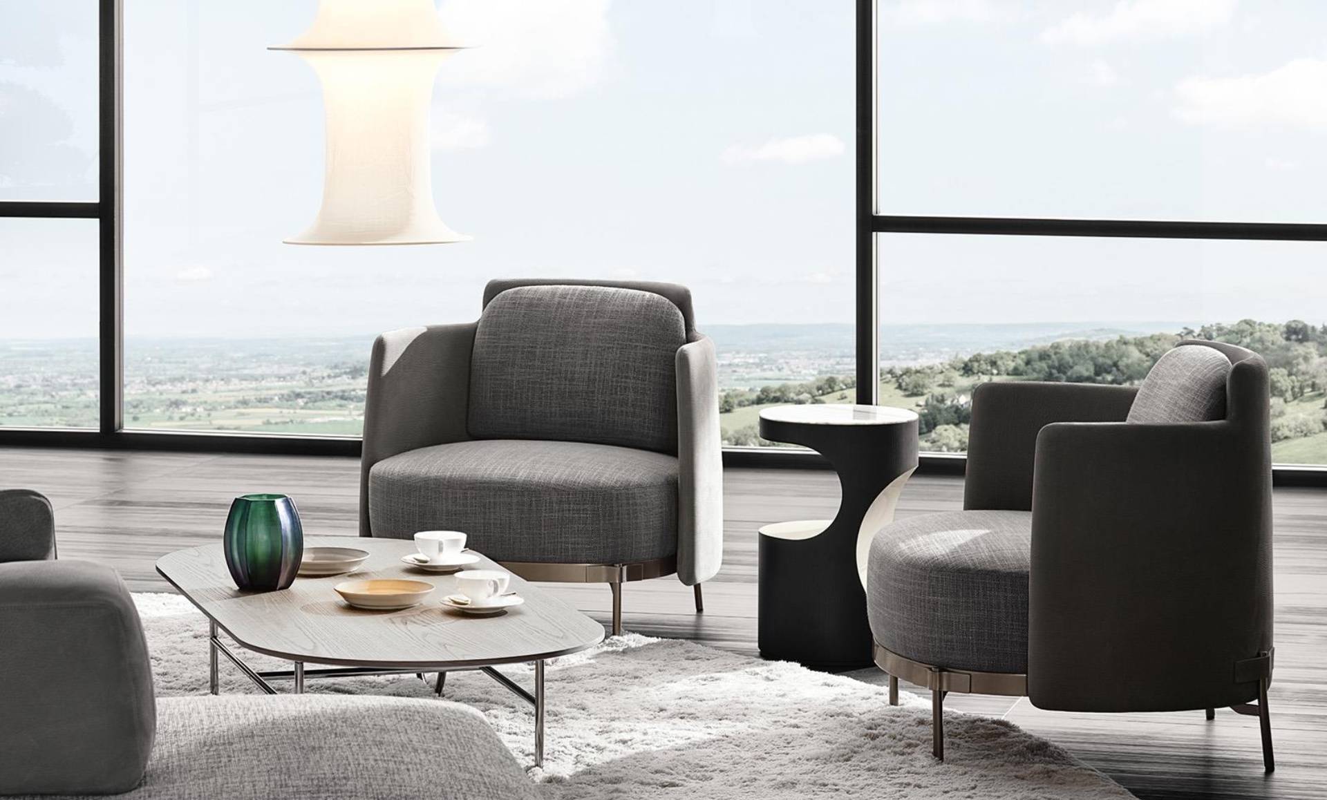 The creative synergy between Minotti and Oki Sato was expressed in 2018 with the launch of the Tape collection - a family of seats and tables characterized by a light silhouette and a strong identity - and the Ring and Waves coffee tables.