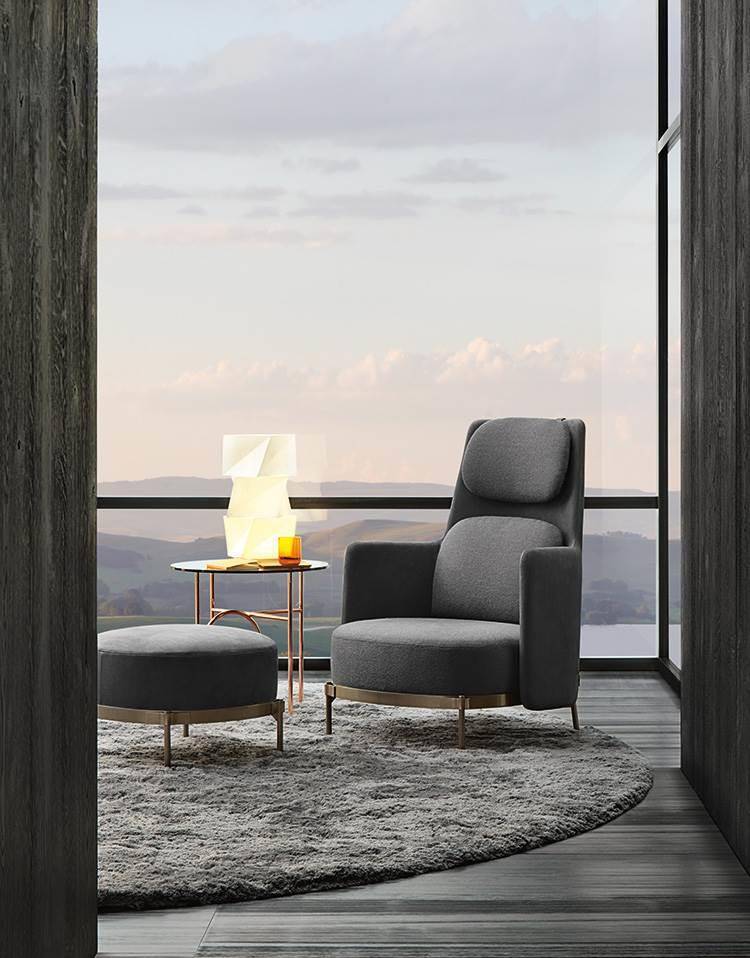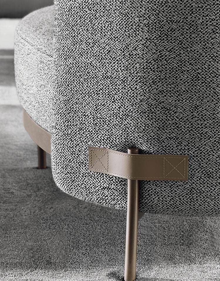 Customizable in a wide range of leather and fabric coverings, it presents two possible sets of pairings. In one version, the fabric covers the back and the seat cushion, while the shell and the tape detail are in leather of the same colour; in the other, the textile envelops the back, the seat cushion and the entire shell, while the tape detail is in Bronze-coloured saddle-hide.