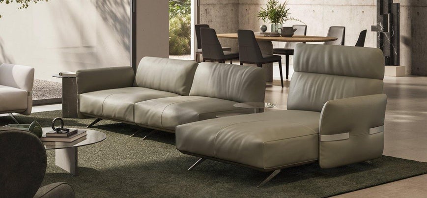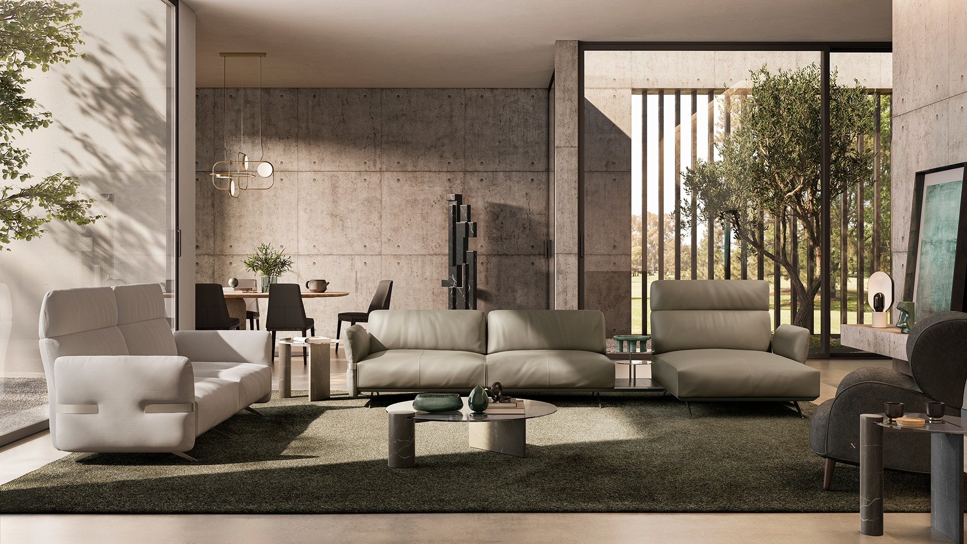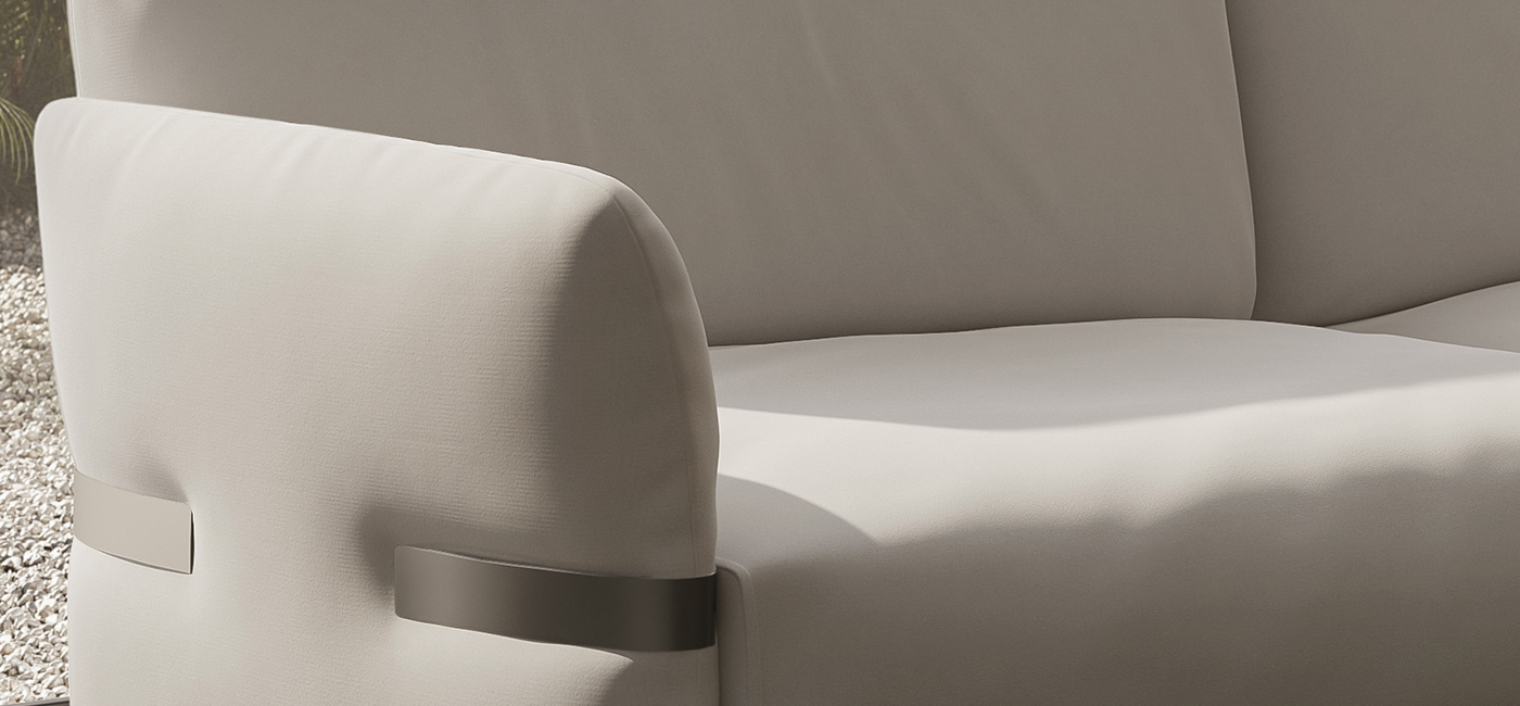 The joyfulness and generosity of Mediterranean culture translates into a versatile seating system with a welcoming familiar design. Playing with heights and geometrical shapes, the armrests have been elevated with satin-finish metal rings on both ends, matching the feet in the same finish.