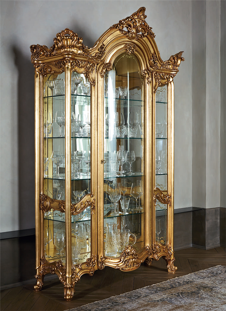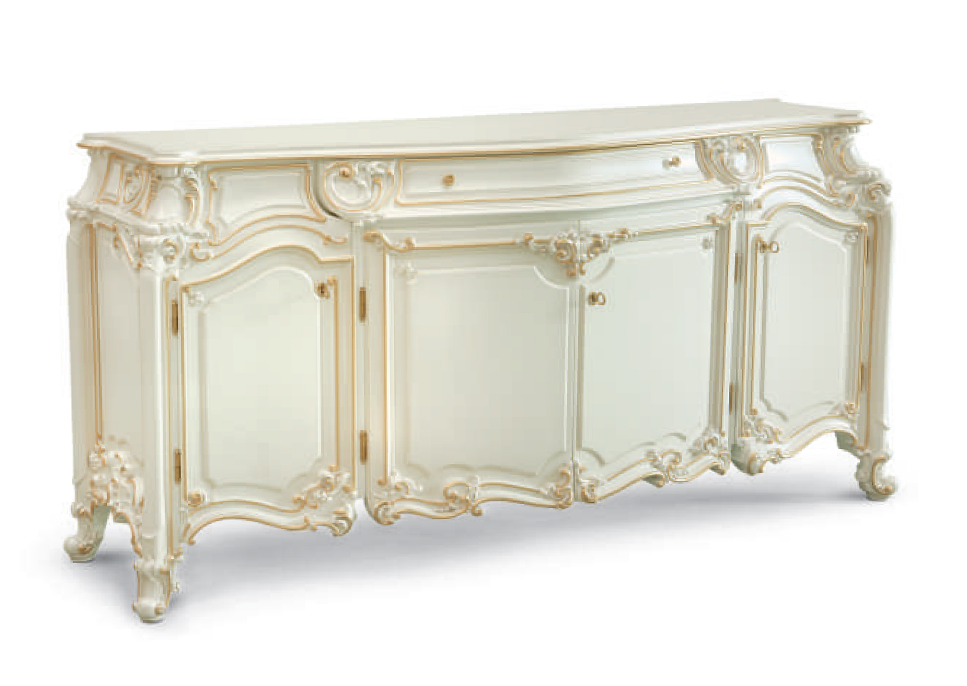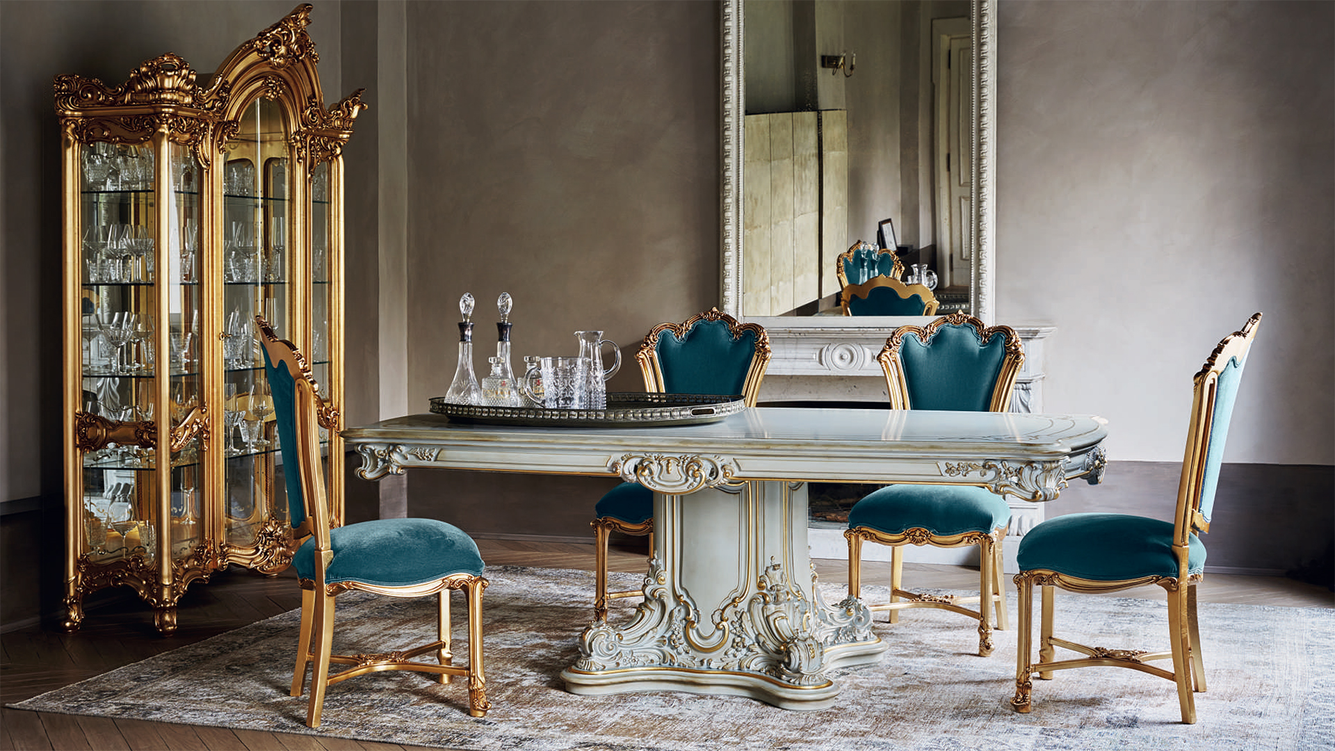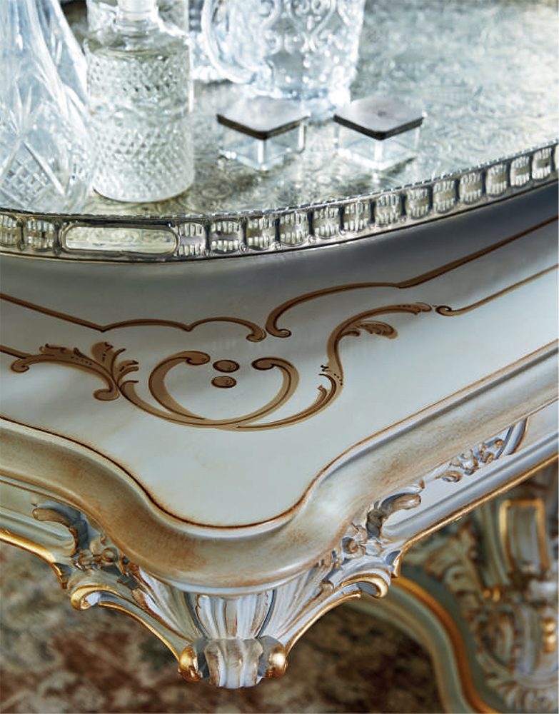 The set is made in a classic design. The main material is solid wood and fine wood veneer coated with non-toxic white lacquer. Furniture is hand carved and painted. The chairs are upholstered in luxury black textiles.