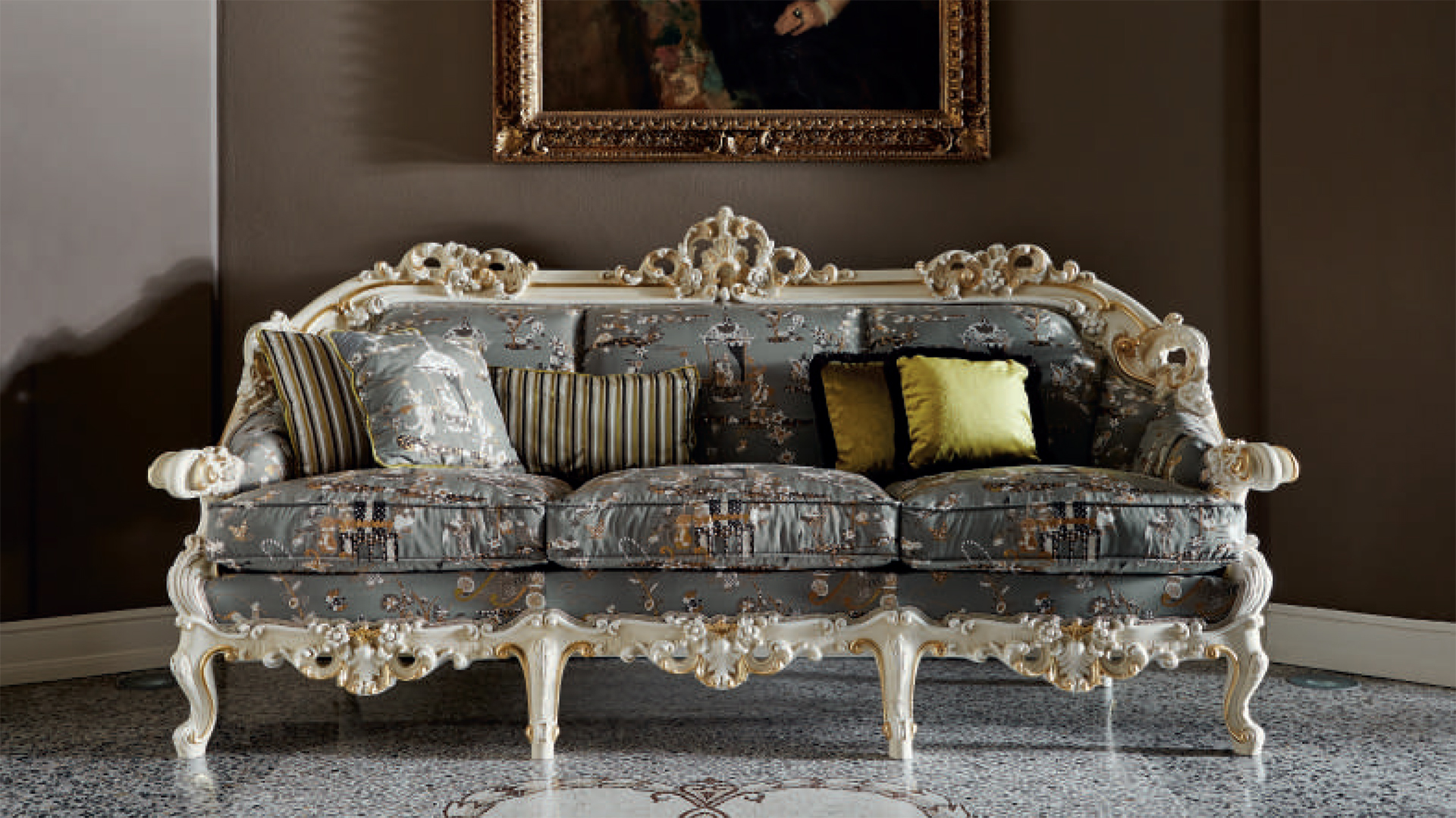 Three seater sofa Mercurio, from the Italian manufacturer Silik. The neutral model is made in Baroque style. The frame is made from solid wood. Colors to choose from a range of companies. Back and legs are decorated with carvings. The upholstery is made of dark-colored textiles. Also available twin model in the same design.