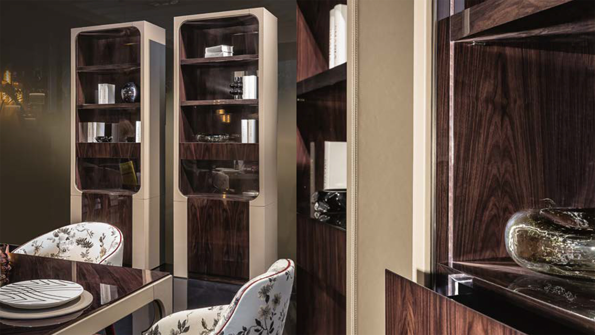 Lock is the elegant materialisation of dualism: straight and curved lines meet as well as leather and wood and dark and light colours. The result is an eclectic bookcase that is part of luxury furniture for offices and living rooms.