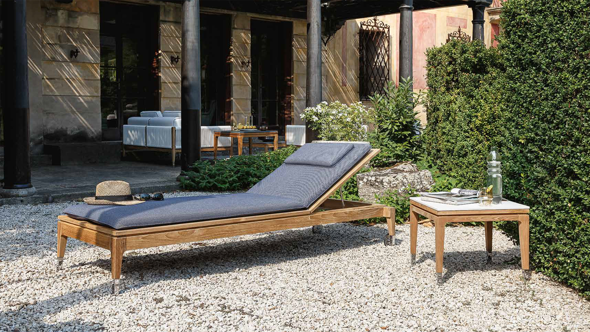 Consequently, thanks to both the linear, chic design and the materials of the structure, it stands out for the resulting refinement. With its elegant grains the teak provides warmth, while the steel brings algid reflections of the surrounding environment. The two materials together create a sophisticated balance of nuances with the colours chosen for the upholsteries. We say “chosen” because the fabric that upholsters the soft padding can be customised. Find out the colour that better matches with you outdoor furnishing among the four types of fabric available and bring a very original and refined look to Palmas.