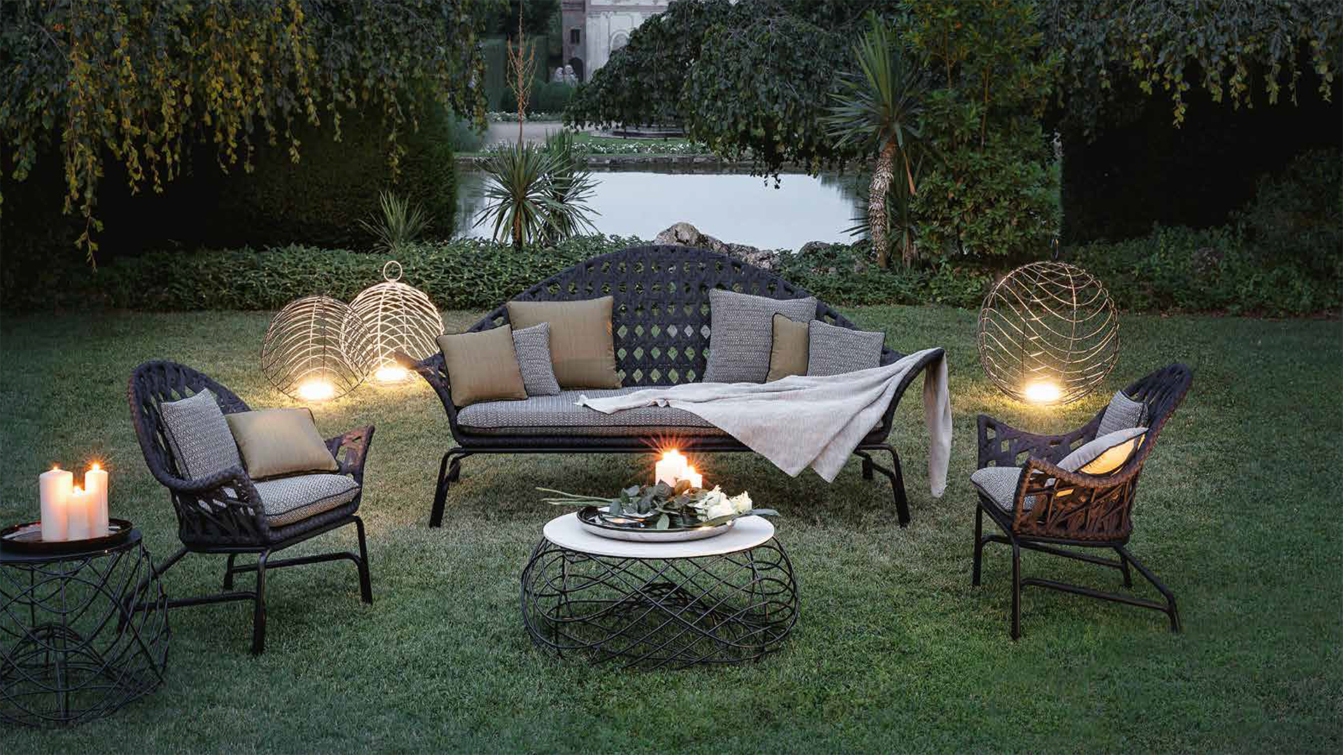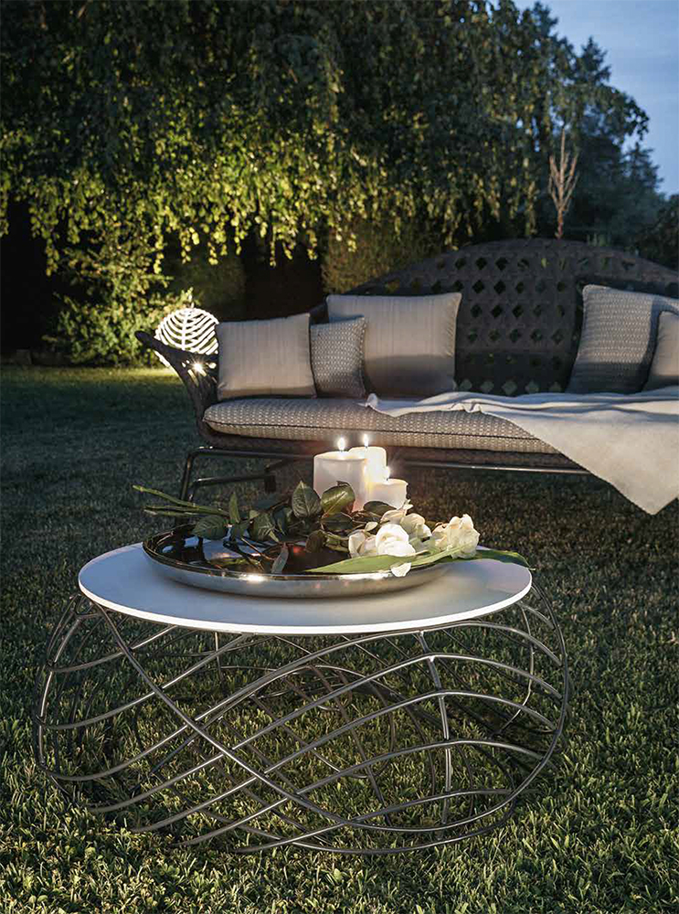 Powder coated aluminium sofa with polyester woven belt cover, removable seat cushion.