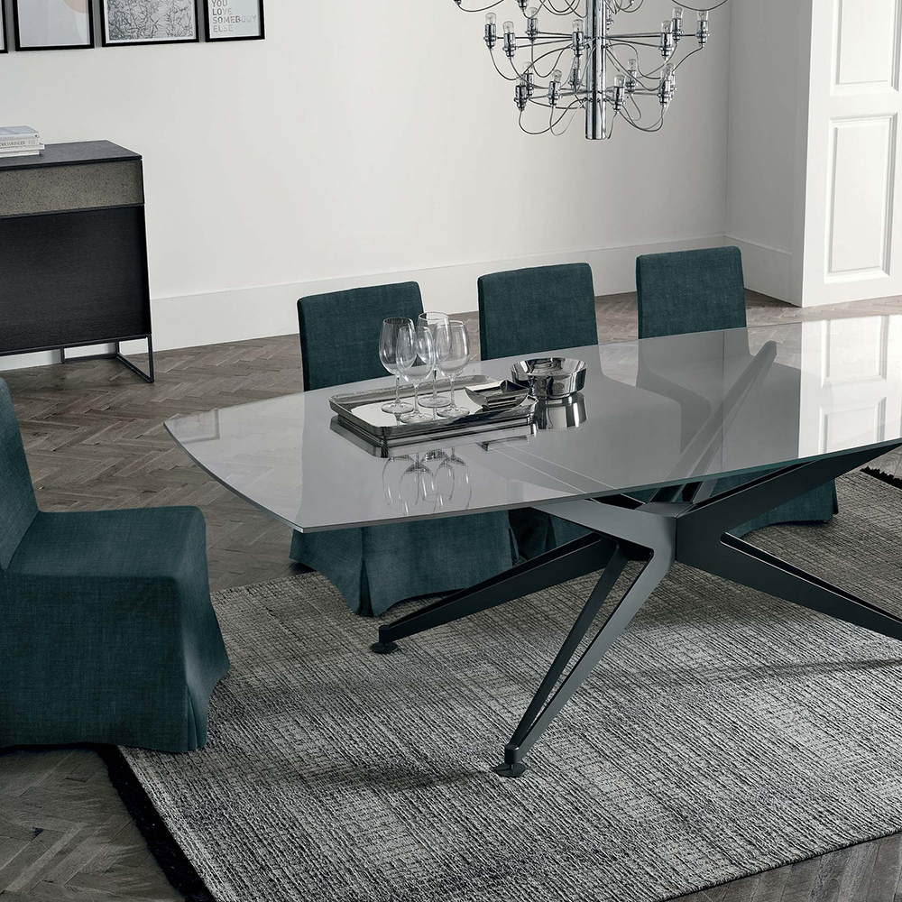 A sculptural table with a solid, star-shaped base that supports the light, plate glass top. A perfect balance of materials and aesthetics.