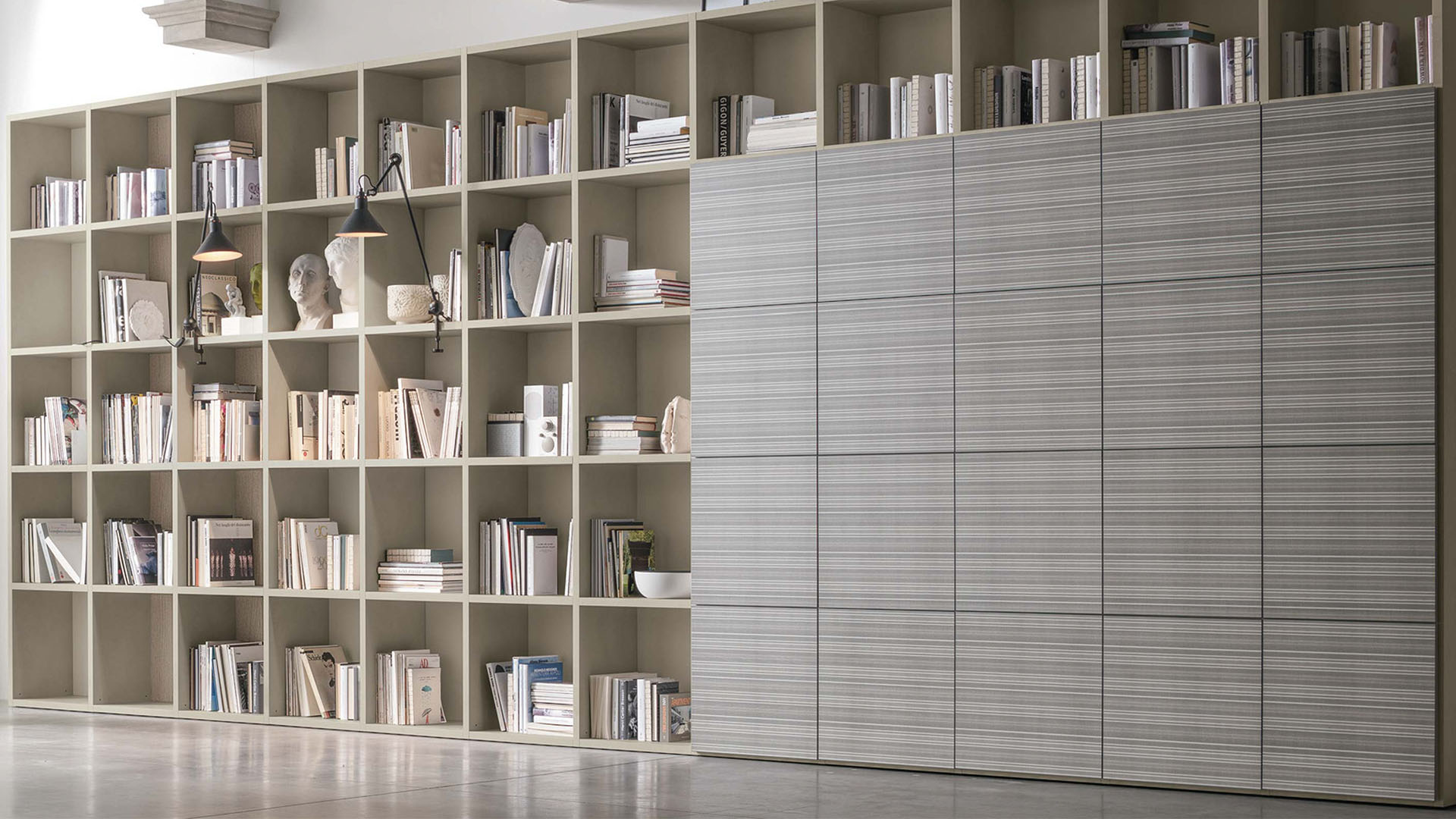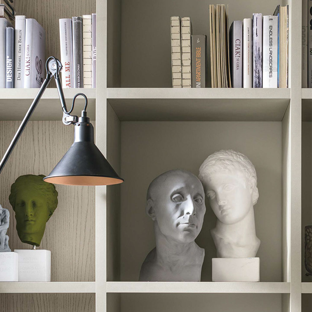 The bookcase alternates modules with or without back panels as well as open volumes with others shut by decorative doors resulting in an impressive variety of styles.