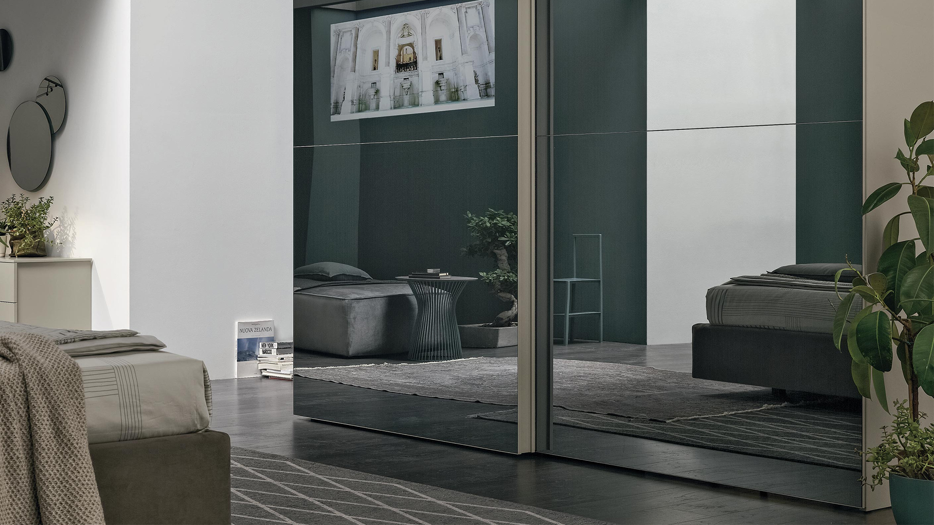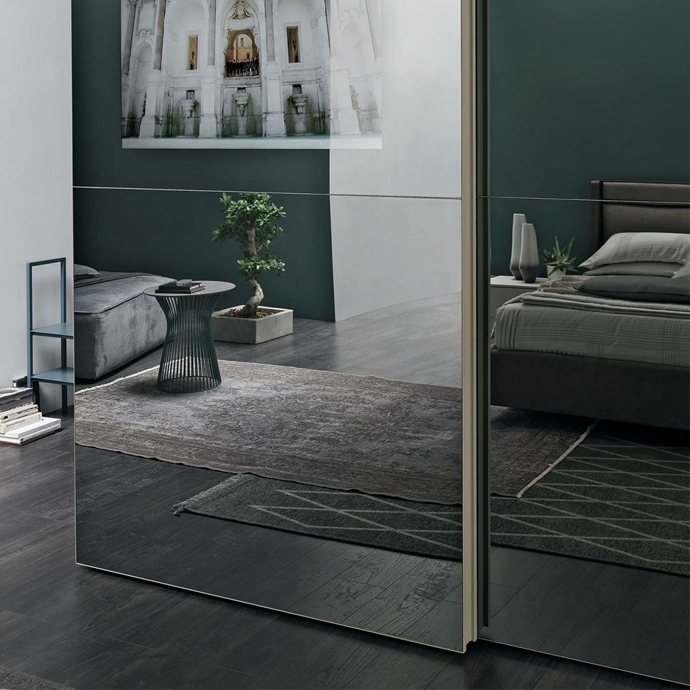 The Vision door pairs design with functionality. Wires are invisible thanks to a device integrated in the door that allows the cables to follow the door safely when it slides open or shut, even when the TV is on.