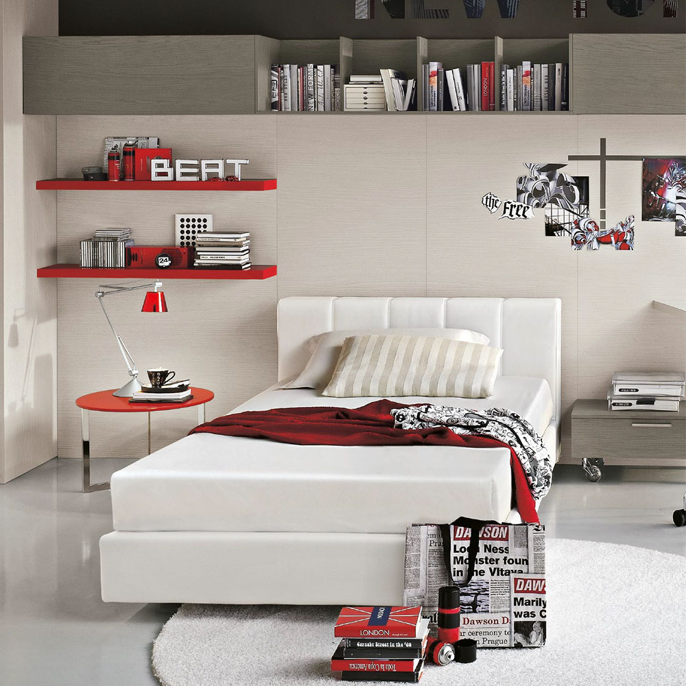 Padded bed available in various sizes, with a storage unit. Bed with finished back.