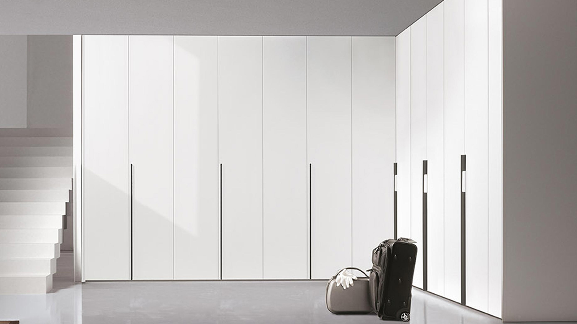 A corner wardrobe that uses all its space. The opening of the two doors of this leaf door version allows easy access to the corner unit, fitted internally with a practical shelf that follows its shape and with essential hanging rails.