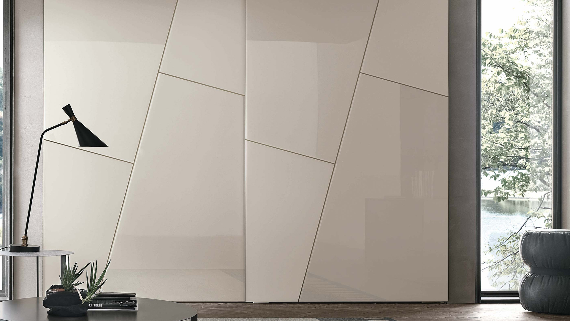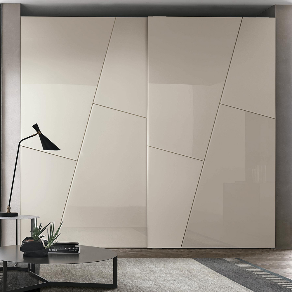 The diagonal shapes on the doors become the decorative motifs that distinguish Kross. Their contours draw oblique lines that combine with the light appearance of the satin or lacquered glass panels. Single-coloured, lively yet subtle effects.