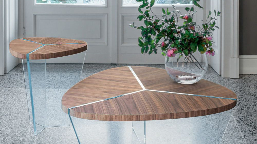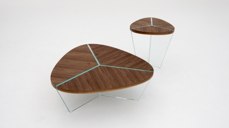 Just like the loves of the famous princess, this Aida is split between two very different elements: a see-through glass base, designed with three firm lines; a round Canaletto walnut, or dark heat-treated oak covered top. A complex manufacture, to harmonize materials and design.