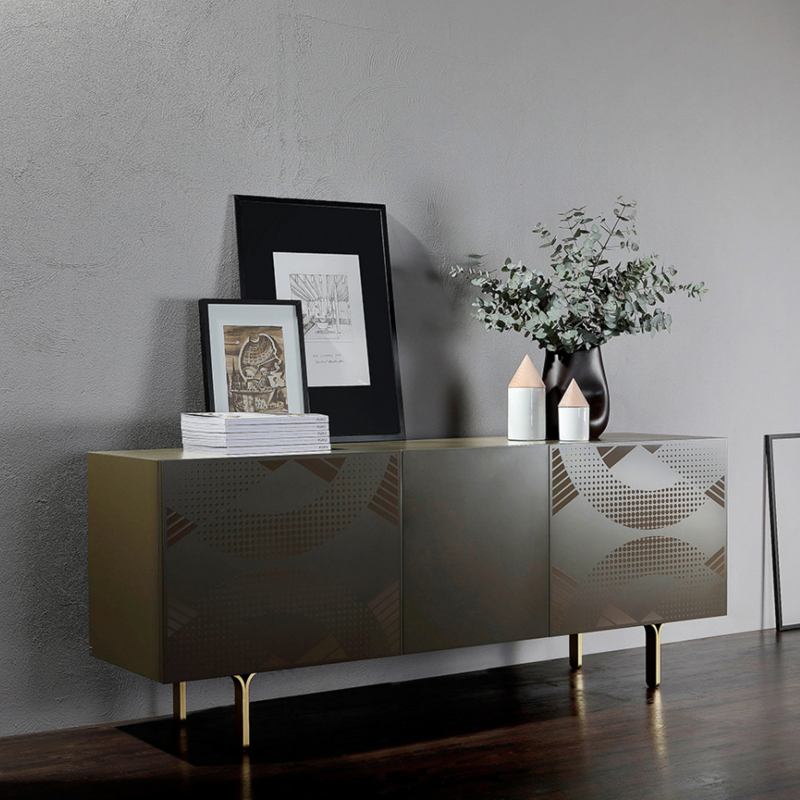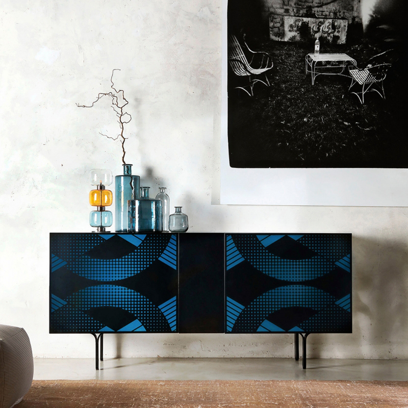 A glance at the Twenties, lights and ballets, intertwining geometries: this is Depop, the best representation of Tonin Casa New Contemporary. Simple metal feet, slightly curving to sustain the wooden structure - which was decorated with a peculiar serigraphy, a texture that will leave everybody speechless. Can you already hear the sound of the cocktail parties?