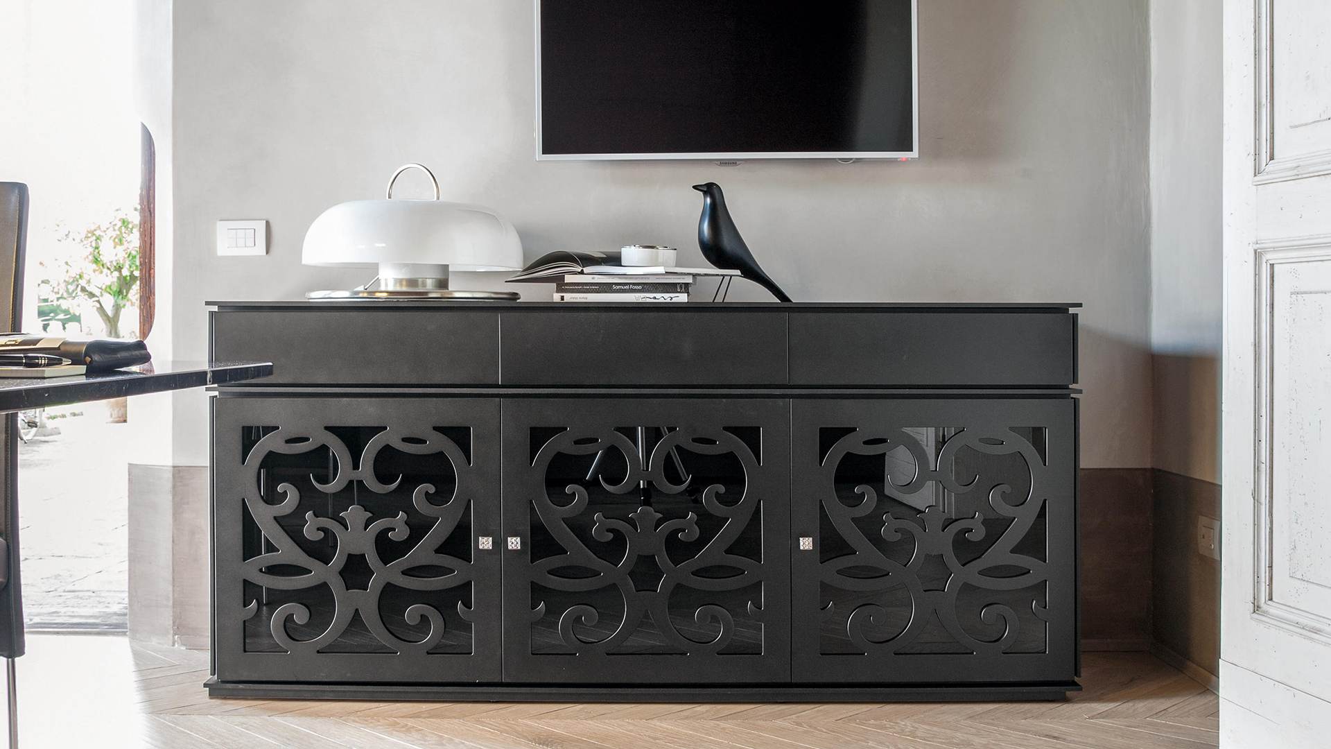 Color-changing and luminous, just like the city it takes its name from, Paris is a system that reveals glass and wood`s discrete luxury, in a multitude of shapes: sideboards, TV stands, showcases, hanging units and shelves, composed in your preferred finishing.