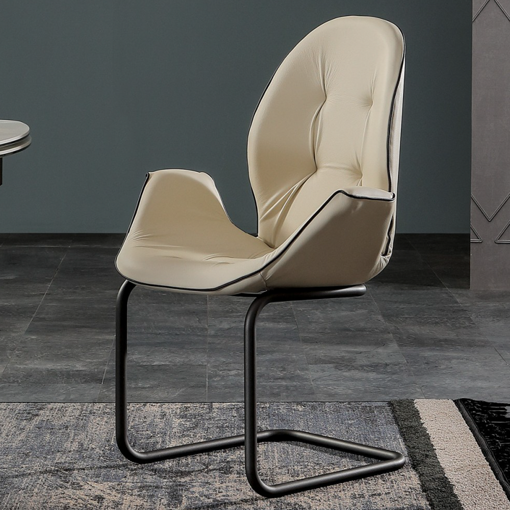 Sorrento peculiar shape, soft curves created by the padded seat, leather or eco-leather covering and its refined creasing are coming back by posing onto a light and thin base. Curved varnished metal legs bend to form a single base, a sledge to support an unforgettable seat.