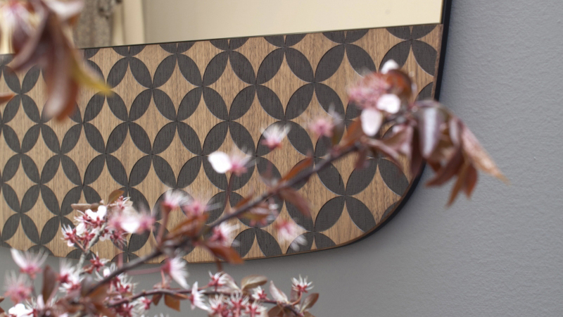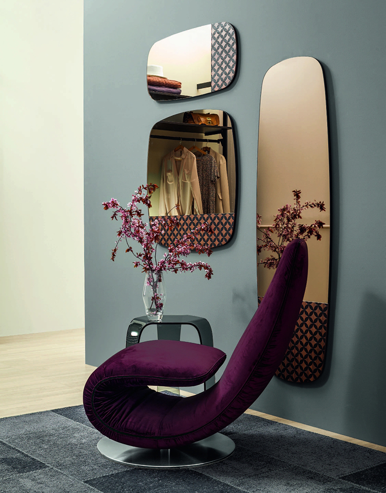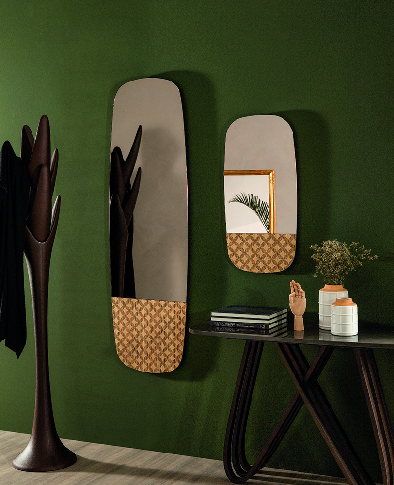 A peculiar cut and a unique shape, breaking to add a new space - other than the mirror - to the structure`s pattern. Wood comes out enrichened, and its marriage with bronzed, or silver mirrors, makes Marguerite a one-ok-a-kind piece.