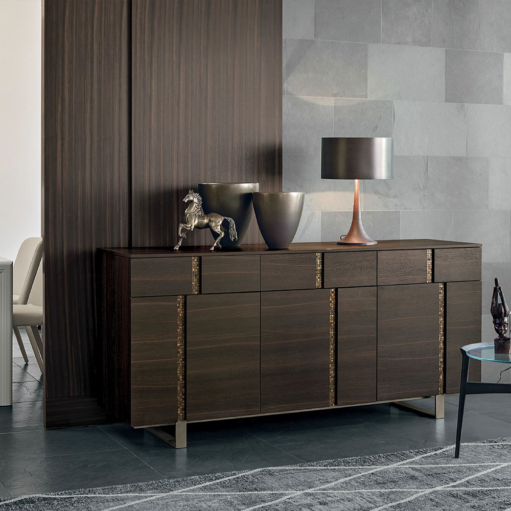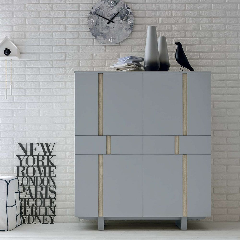 3-door Athena sideboard with a textured eastern ash carcass, matt anthracite 160 lacquered inserts and anthracite 160 metal base.