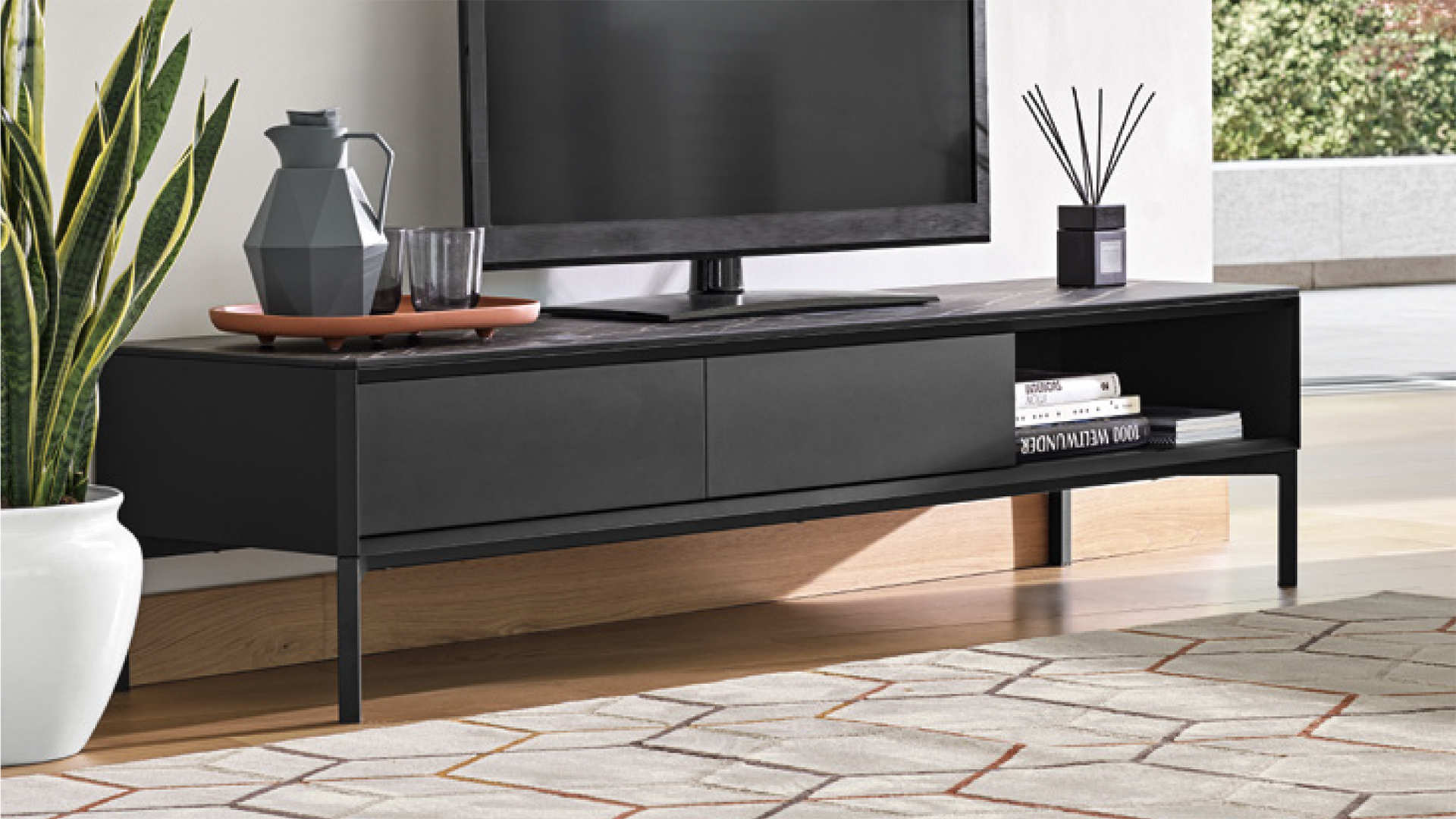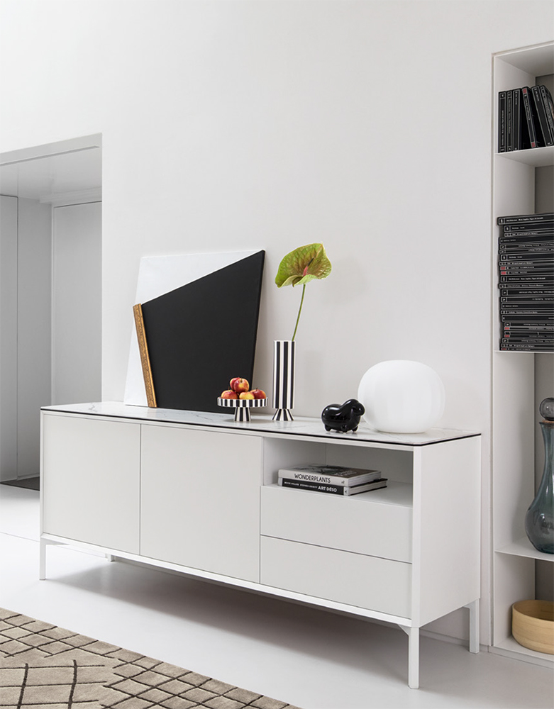 York was born from the idea of playing with the thickness of its panels in an attempt to turn a solid sideboard into a light object. York is a family of furniture for the sleeping area characterized by inclined edges and square-section front feet, rotated by 45 °, which join the perimeter of the case. This family is enhanced by the ceramic top, which guarantees exceptional resistance as well as being an easy to clean and highly hygienic solution.