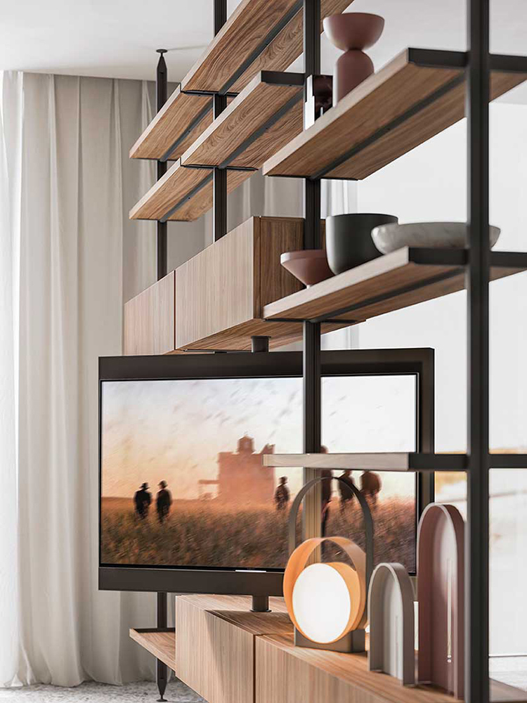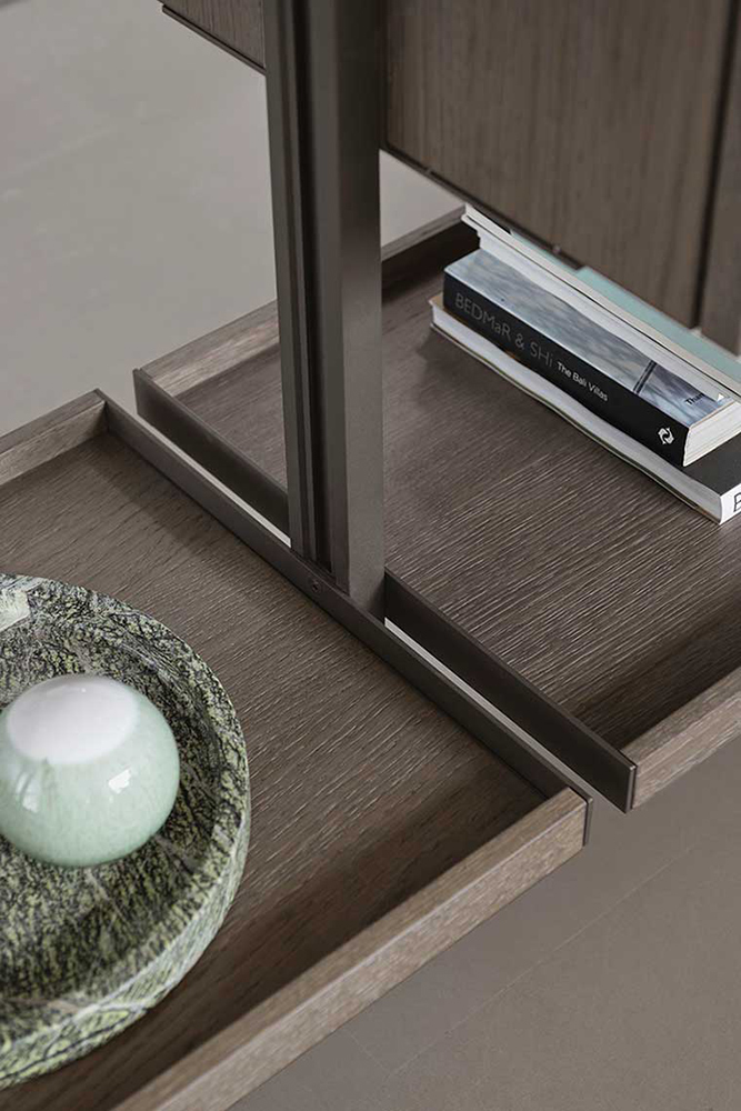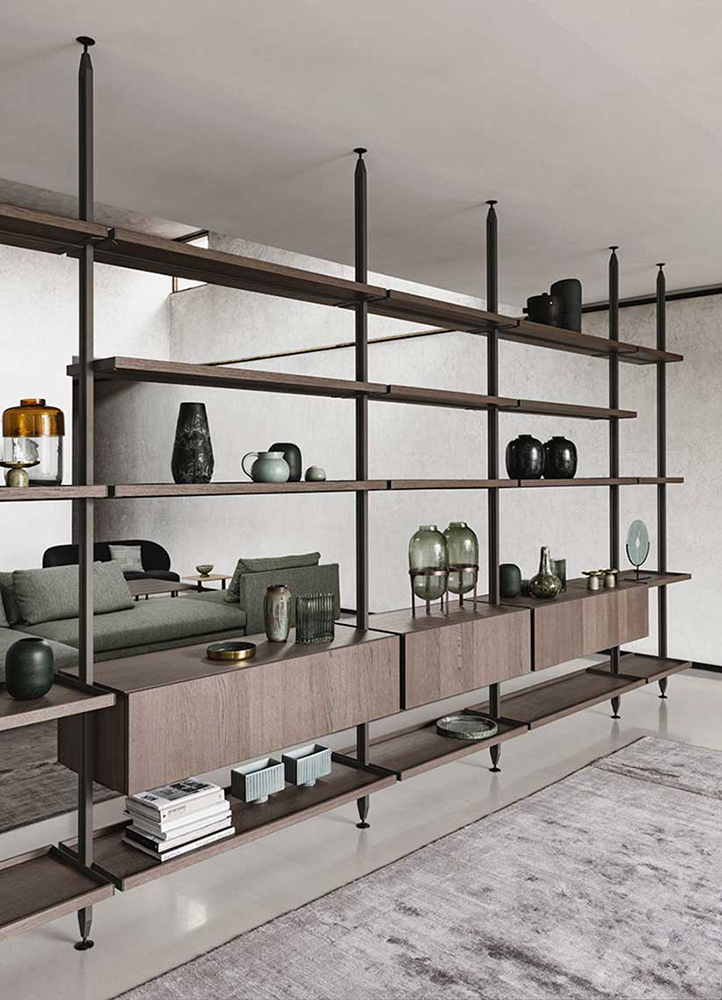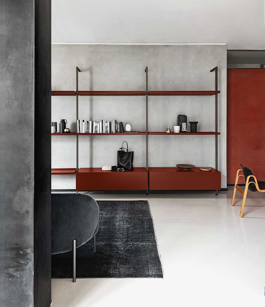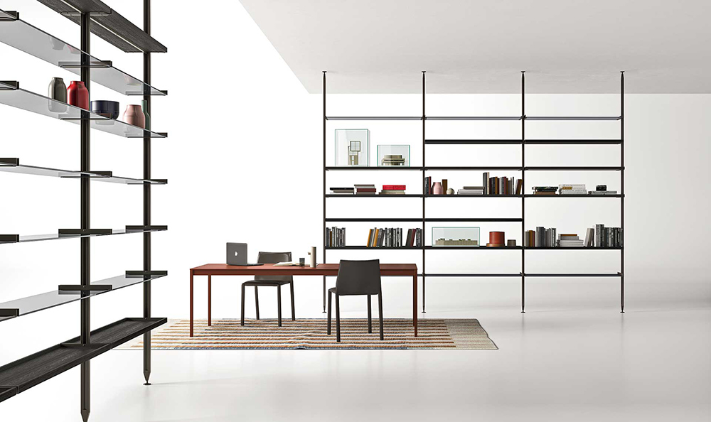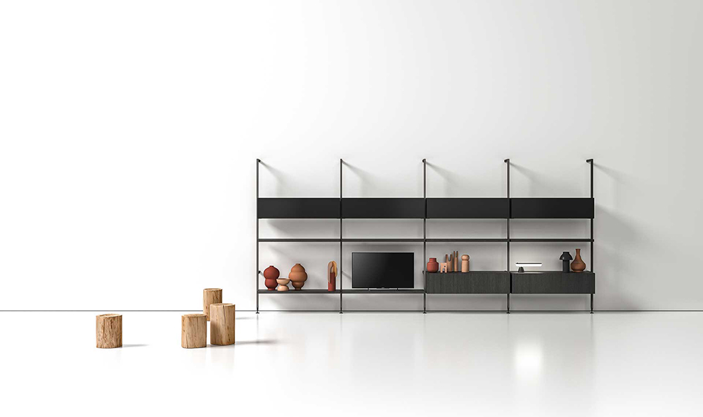 ANTIS is a bookcase unit for your living space that can be freely built. You choose the height and position of the different elements to create many configurations. Each Antis component can be positioned freely at your preferred height, and you can use as many components as you like. Most importantly, this bookcase offers an exclusive, simple hook mechanism for attaching the elements: an aluminium upright with no prefixed hooks or holes, meaning you can move things around whenever you like.