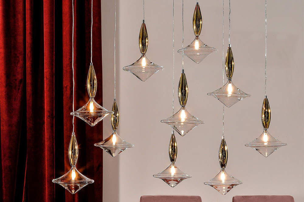 A hanging lamp, thought to create a constellation above your tables. Etoile is made of a lighting part - made of transparent glass - and an upper part made of either bronze, or gold mirror; the one, six, ten or twenty lights versions, allow to create your ideal set, your perfect light.