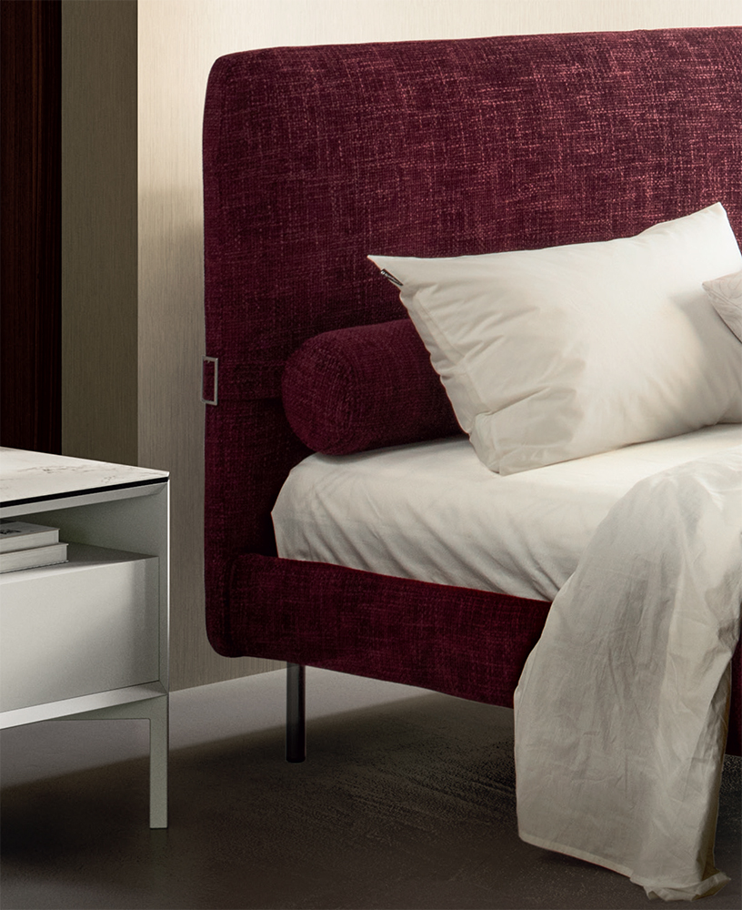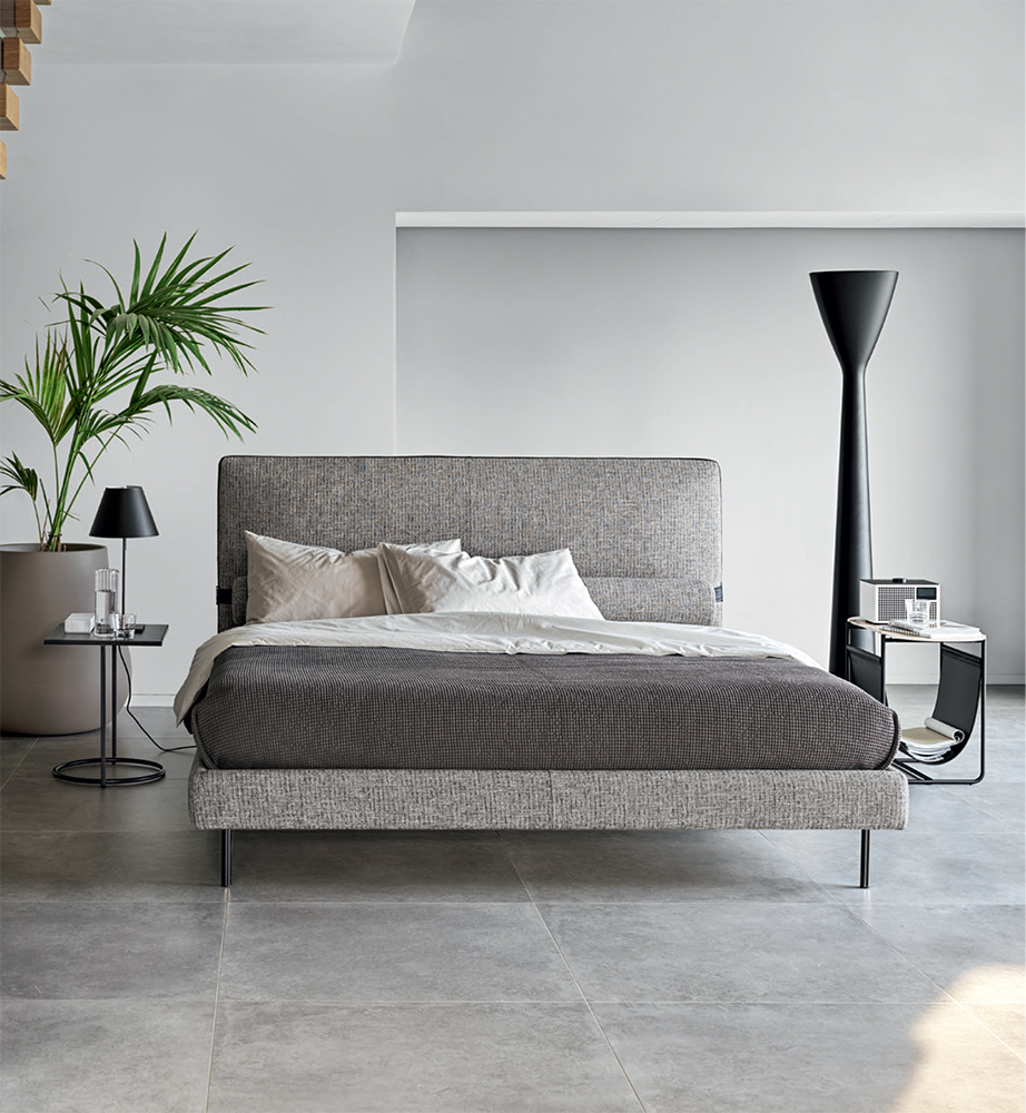 Taking its cues from the eponymous sofa, this bed boasts several striking features. The headrest is girdled by a decorative band which can be made to contrast against the base by using a different material or finish. Slender cylindrical feet hold up the bedstead. With fully removable covers, this bed comes either in fabric or leather.