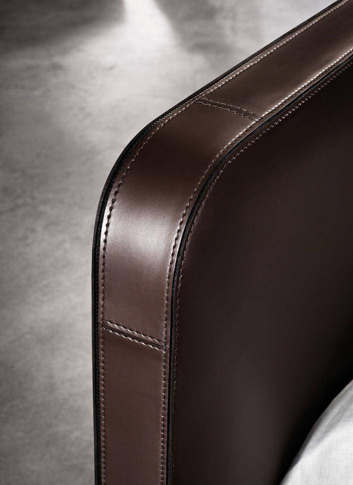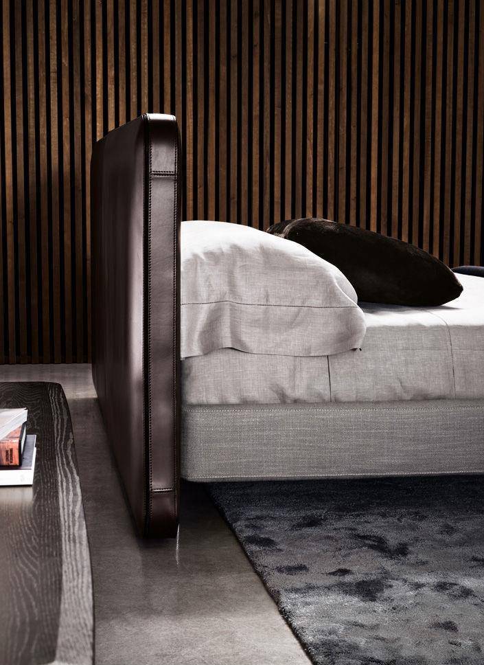 The Tatlin bed is all about the headboard, upholstered in saddle-hide, in the colours Mud, Tobacco, Dark Brown and Black, with detailed workmanship that calls to mind refined luggage - in the rounded corners, the stitching, the lush thickness.