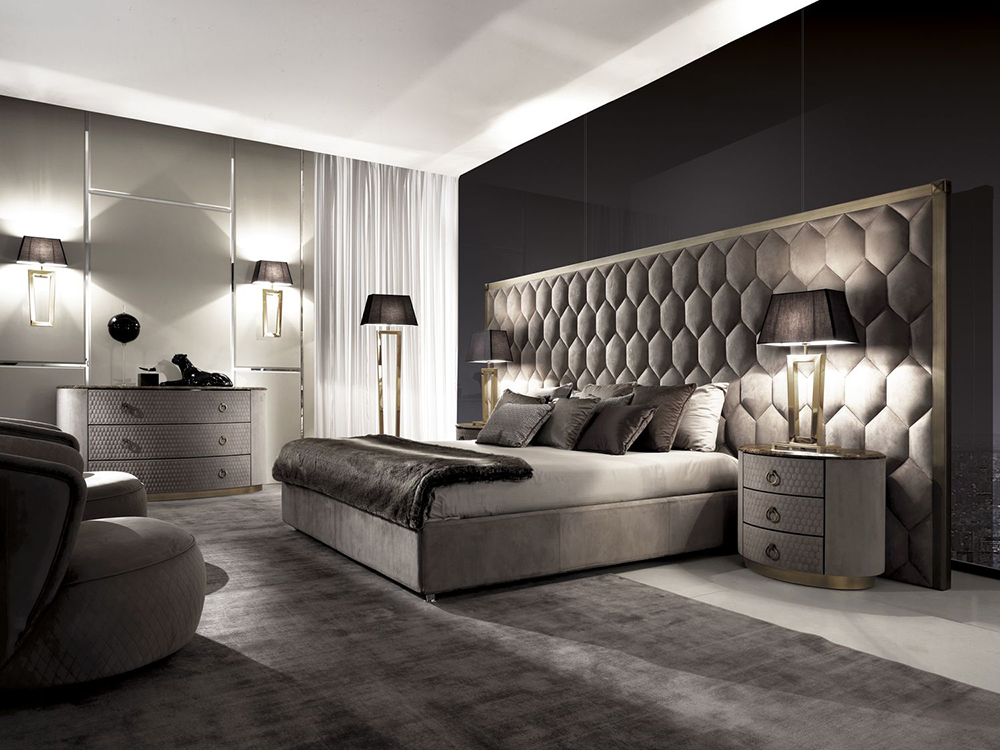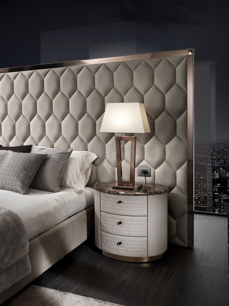 Nightstand with MDF structure and marble top. The base is metal. The lining of the bedside table is made of leather. Various finishes are possible.
