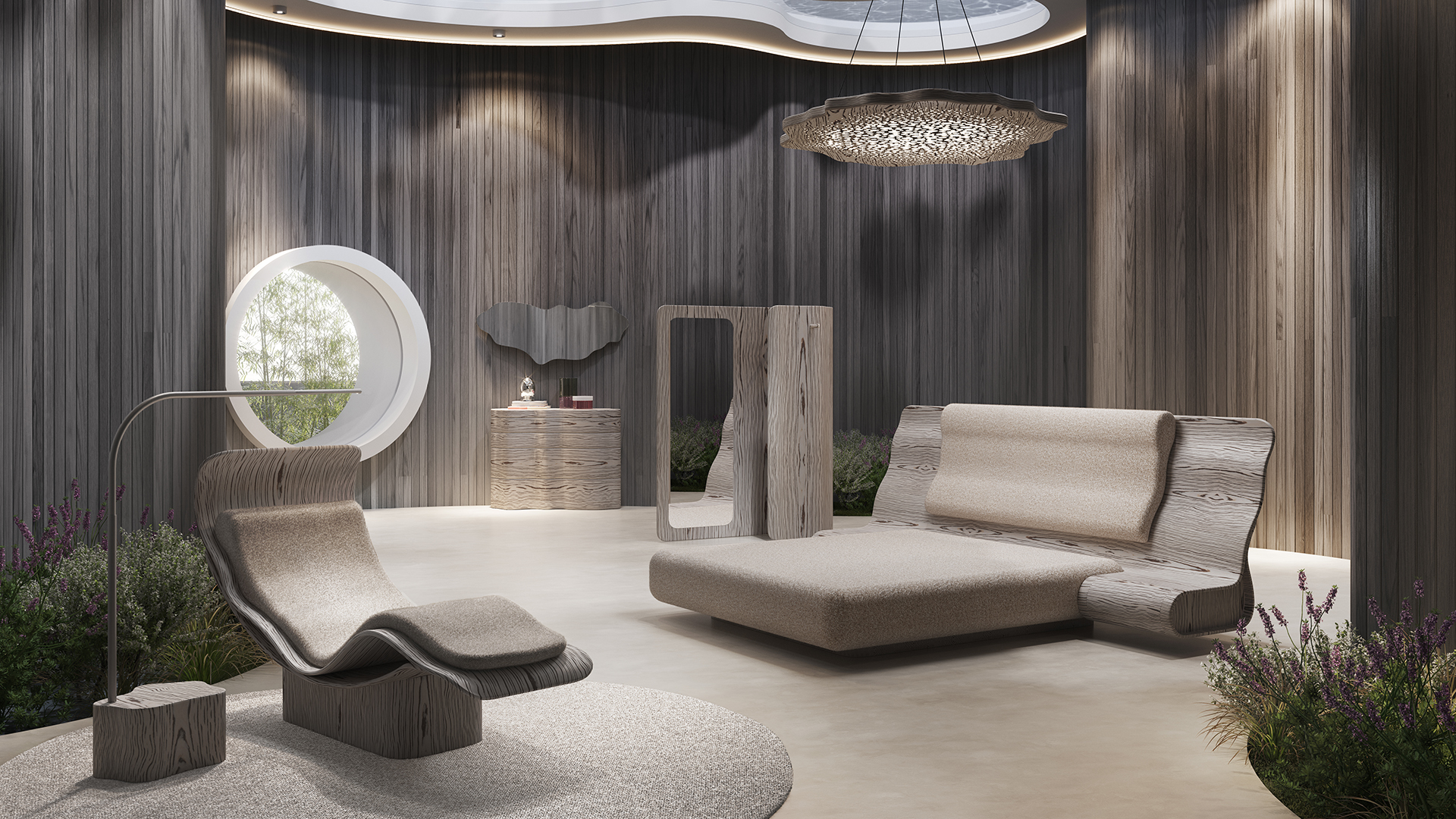 The bed has soft, reassuring contours, in which the materials seem to spontaneously take on the sinuous and organic lines typical of Lovegrove`s style. The broad flowing headboard stretches out to form two bedside tables. The bed appears both a primordial and a futuristic bedchamber. It looks like a primitive couch, shaped only by the silent, incessant etching of time.