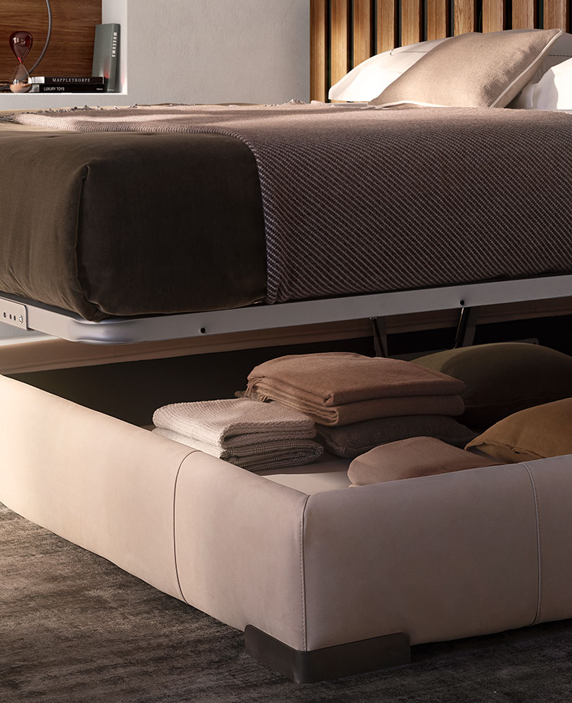 Fenice is the bed which effortlessly brings together aesthetics and function in a triumph of finesse. Cosseted by the big plush cushions on a pectacular looking and the slightly tilted headboard which provides a highly comfortable posture for reading and - obliquely inclined as it dovetails with the bedframe - it also creates an elegant geometric detail.