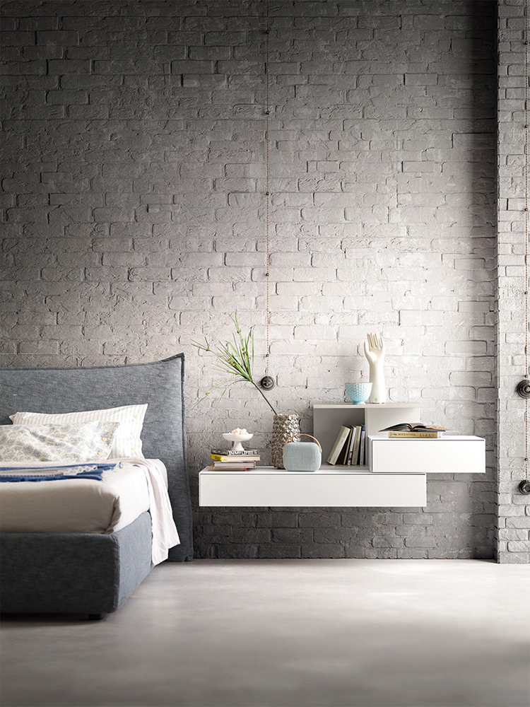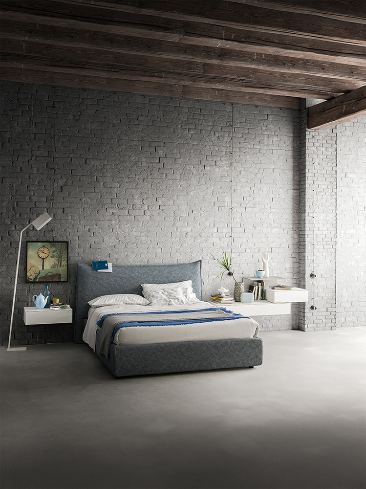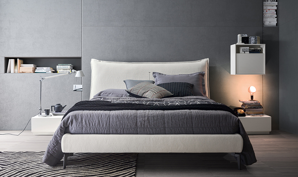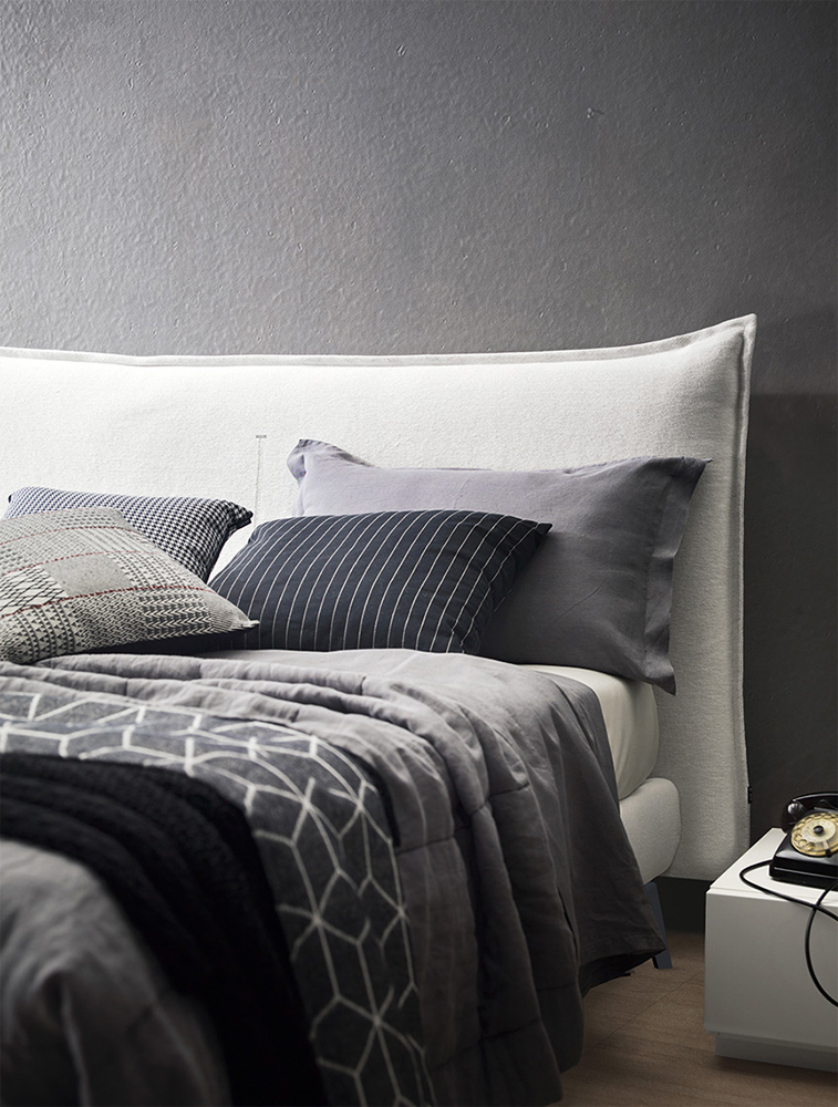 A soft and comforting upholstered bed characterized by an enveloping headboard enriched with visible contrast stitching.