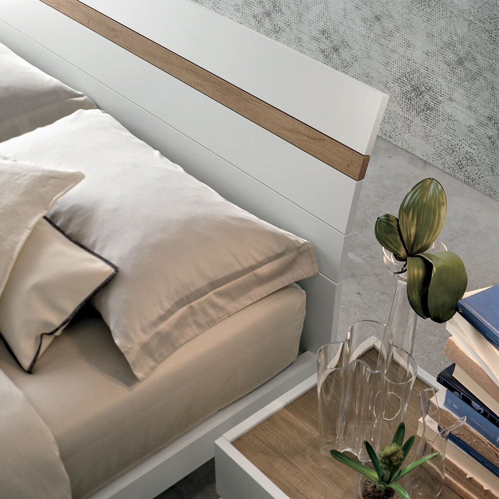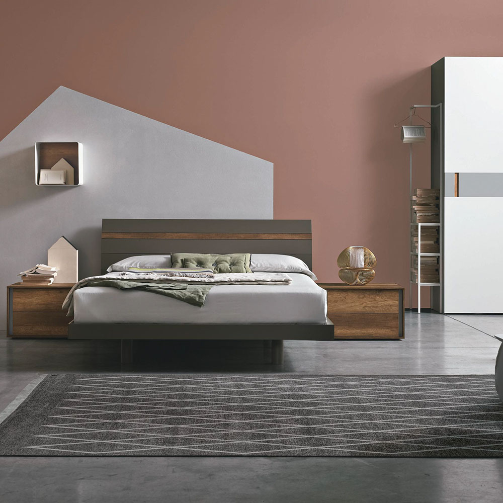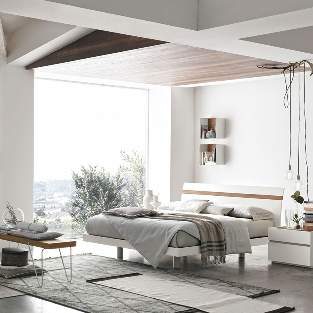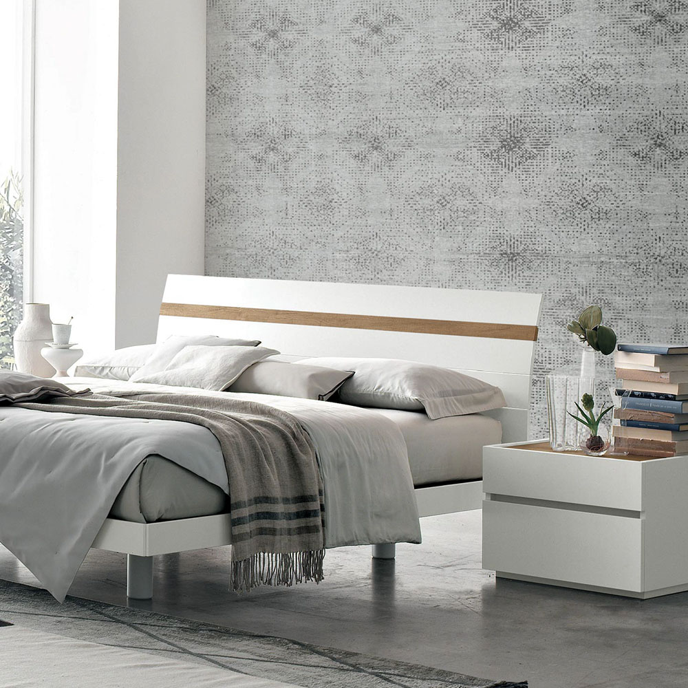 Bed in light knotted textured and textured light cement finishes.