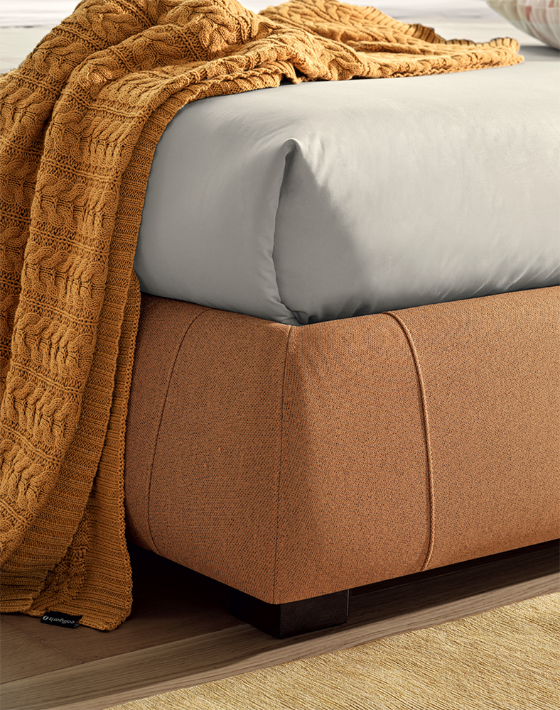 Noa is a sculptured bed with a harmoniously rational structure drawing inspiration from rocks sculpted by the wind. Soft and voluminous, the simple-looking headboard has a three-dimensional beauty which is accentuated further by the topstitching on the curved surfaces. The item is available with three versions of the feet in wood or one version of the feet in metal with the option of choosing a look and height from the ground that suits the customer best. Noa is available with a fixed bed base or container unit. Can be upholstered in fabric or leather.