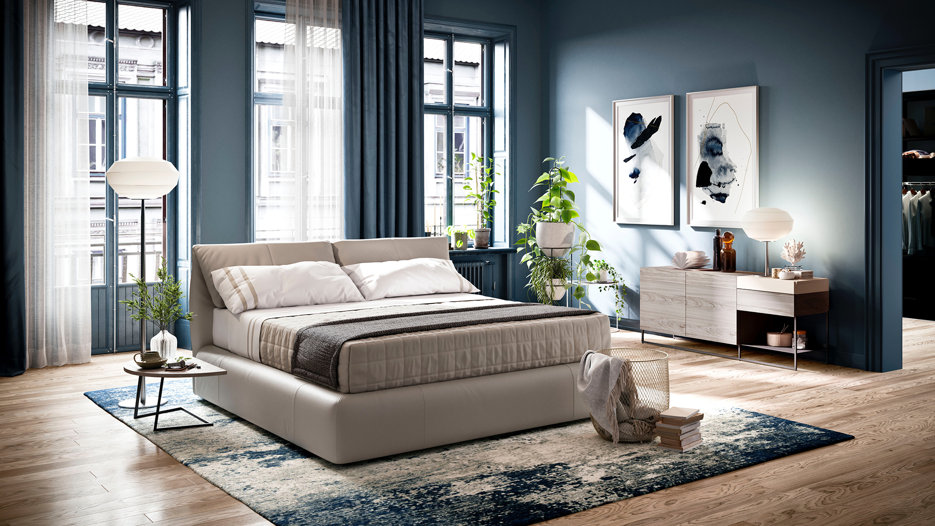 A distinctive feature of the body of Orbitale is the special shape of the headboard, which “covers” the large soft cushions. This is a bed with a solid and geometric design, able to recuperate and prepare for a new day. Available in various finishes, both in a box for linen and without.