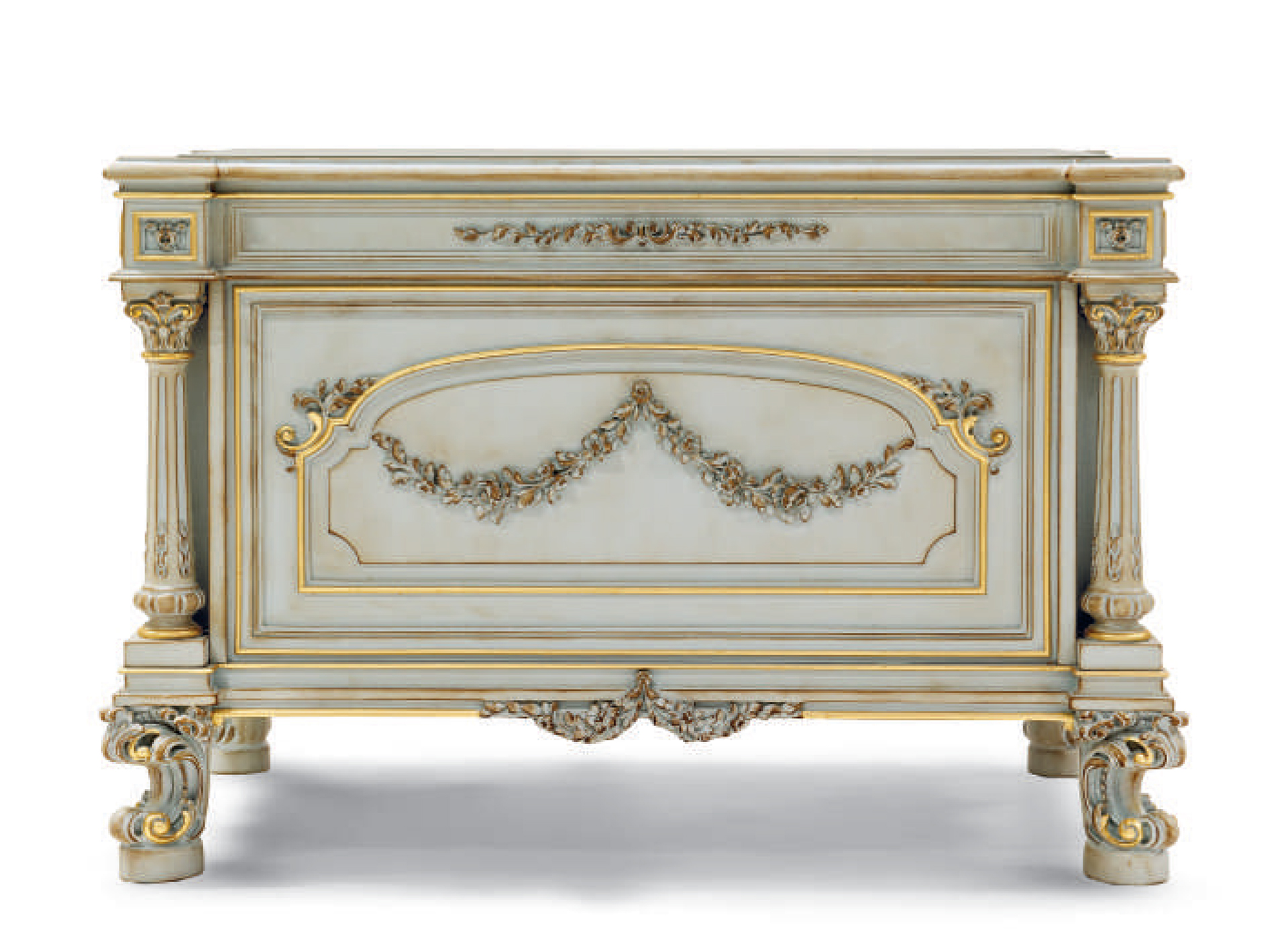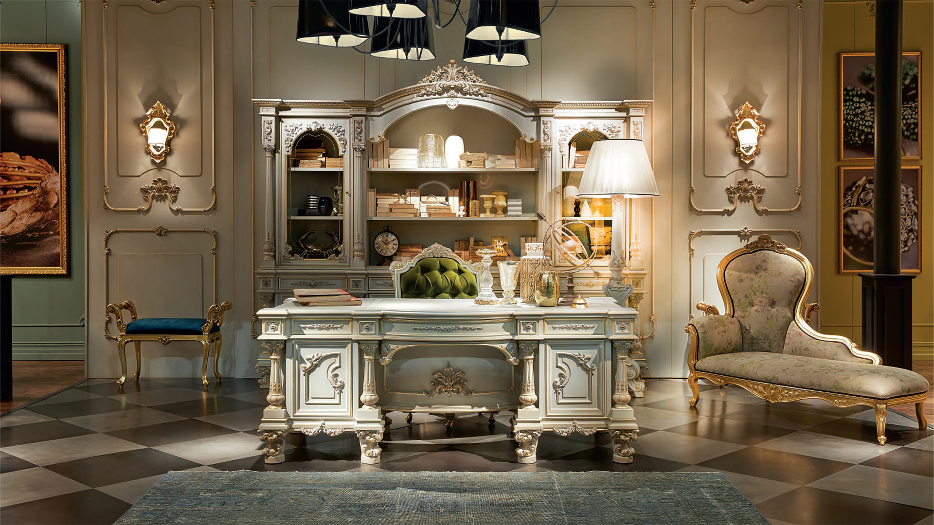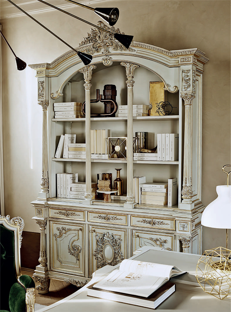 Headsets for office Giove, from the Italian manufacturer Silik. Includes a Desk, chair and bookcase . The frames are made from solid wood. Finish furniture lacquer, decoration decoration -gilding. Seat cover and cover plates on the table made of leather. The armrests are complemented with soft inserts. Decoration is the decorative thread.