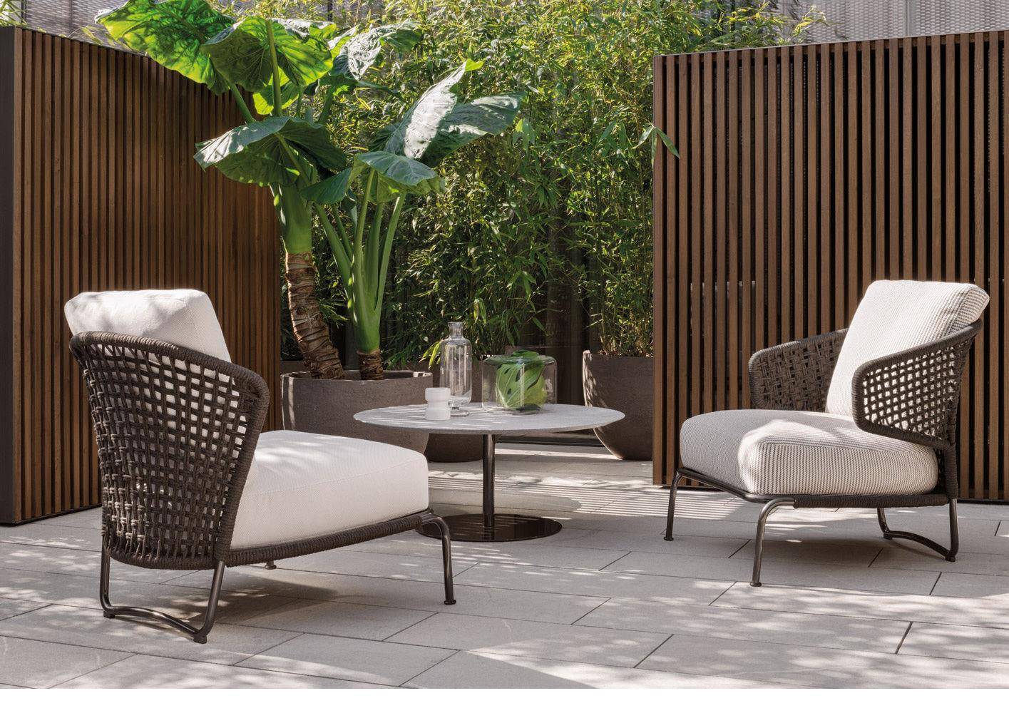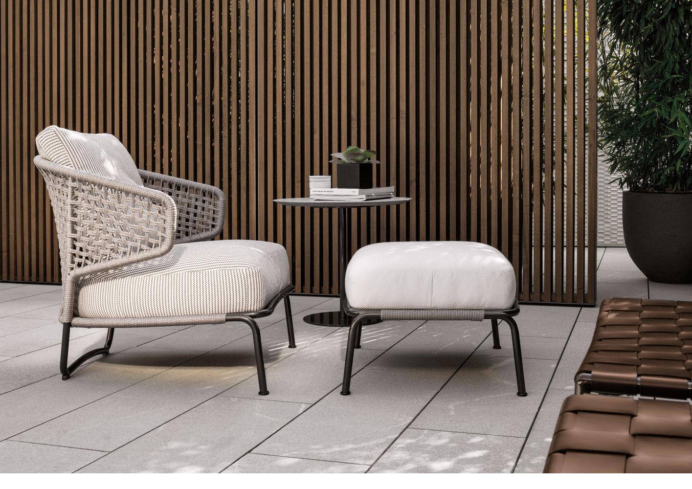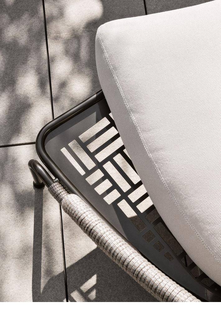 The Aston “Cord” Outdoor collection comes with a pewter colour polyester-painted metal frame specially treated for exterior use, as are the padded cushions, which are covered in waterproof fabric. The seat back is in a special braided 7 mm diameter polypropylene cord, available in the following colour variations: Light Gray, Dark Brown, Sand, Sunflower, Khaki Green and Rust, a perfect match for the fabrics in the Art Lifescape 02 textile collection and the shade of Alison “dark brown” outdoor. The painted metal frame is finished with a special polyester paint for exterior use in Pewter colour and the seat back is in a special braided polypropylene cord, available in two colour variations: light grey and dark brown. The seats feature an exclusive Minotti Studio laser-cut geometric design. Inner padding of the cushions is in highly durable expanded polyurethane covered in water repellent fibre.