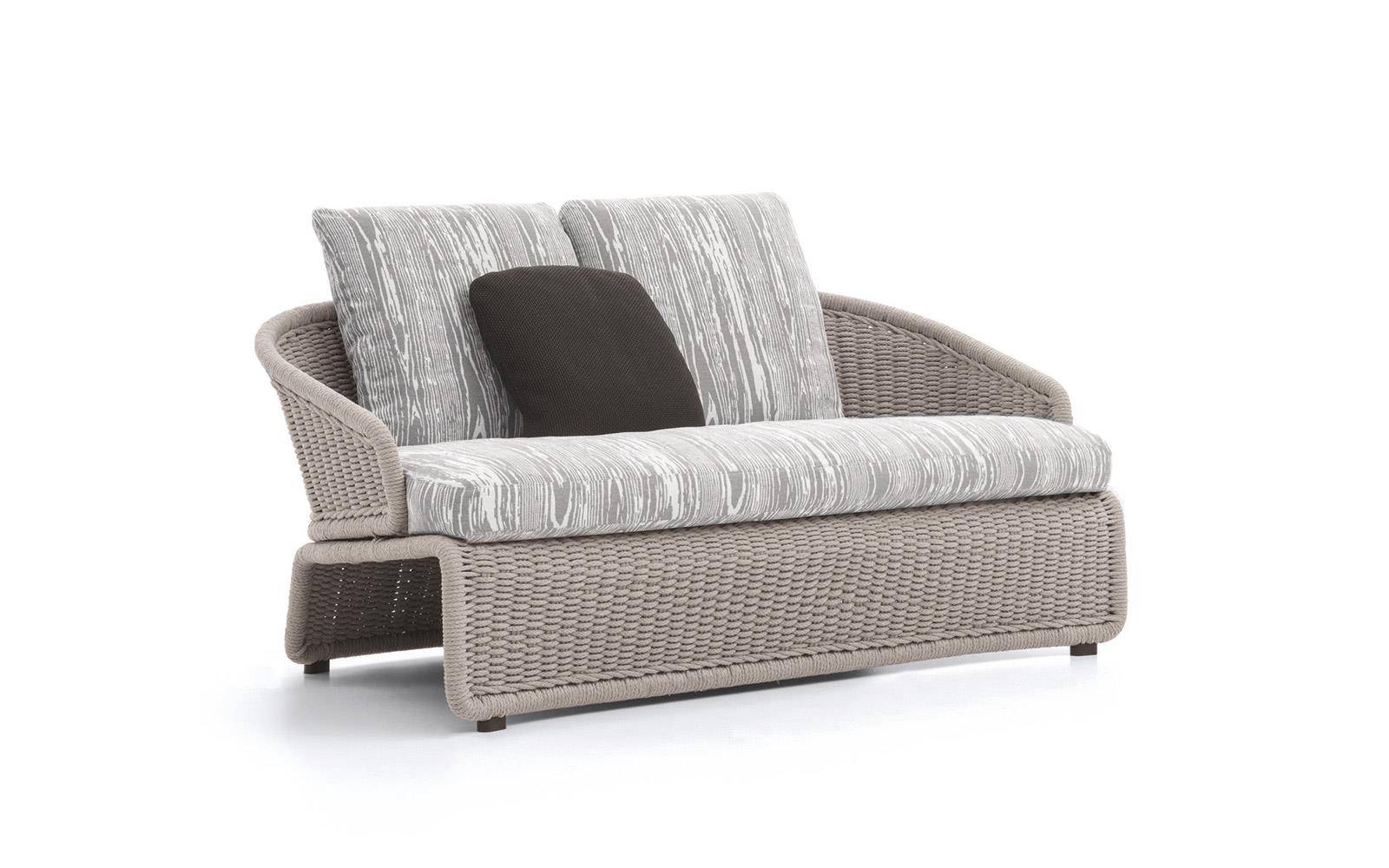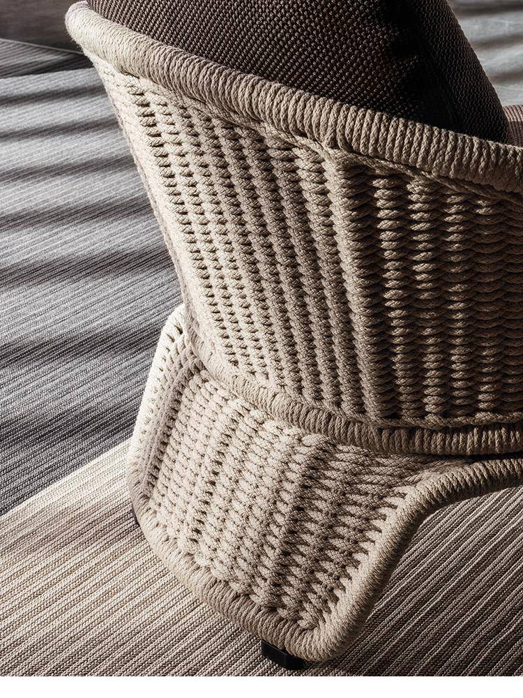 The metal structure is first sandblasted to remove any imperfections and then epoxy powder-coated in the following colors: Clay, Pewter, Sunflower, Khaki Green and Rust. The metal structure is completely covered in special polypropylene fiber that is similar to traditional woven wicker and comes in an array of sophisticated colors: Sand, Elephant Grey, Charcoal, Sunflower, Khaki Green and Rust. The epoxy-painted finish on the metal structure is color-coordinated to match the cord. It is in Pewter color when the cord covering is in Elephant Grey or Charcoal, and is in the same shade as the cord for the other colors: Clay, Sunflower, Khaki Green and Rust. The cushions have internal padding in high resilience expanded polyurethane foam and are covered in water resistant fiber and fabric. The completely removable upholstery covers come in a vast array of outdoor fabrics that look sensational when combined with the cord structures.