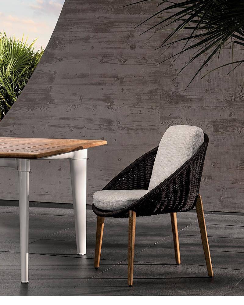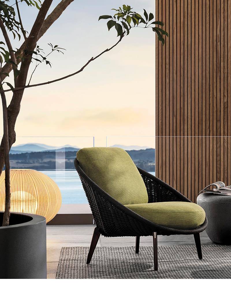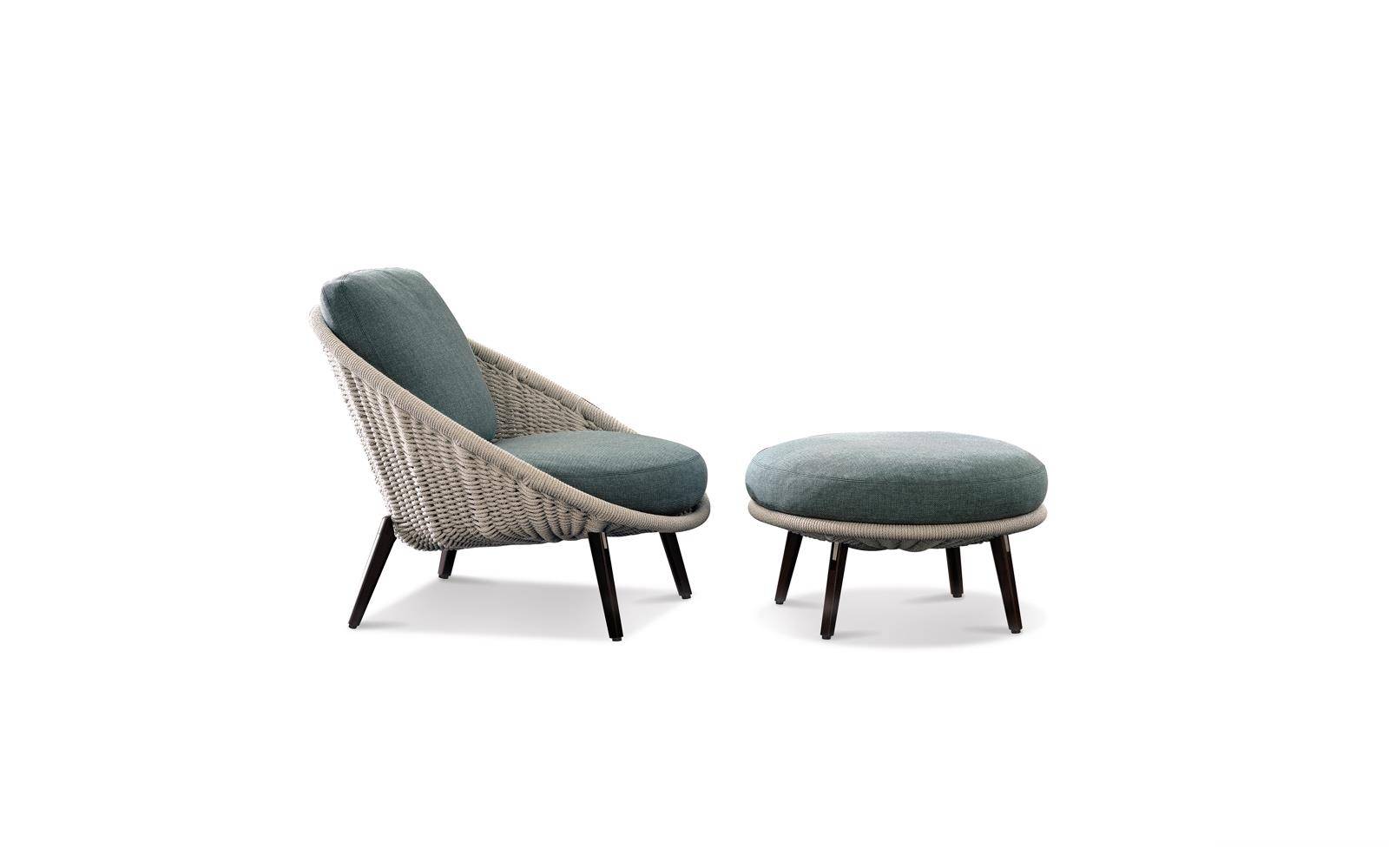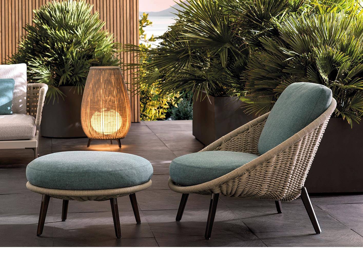 Lido Cord Outdoor is comprised of a sofa, armchair, footstool, dining and lounge little armchairs, all with an enveloping design that conveys the idea of a comfortable nest.