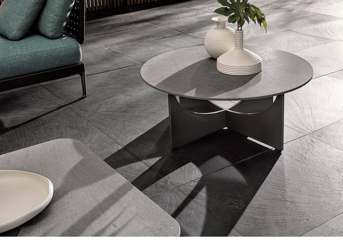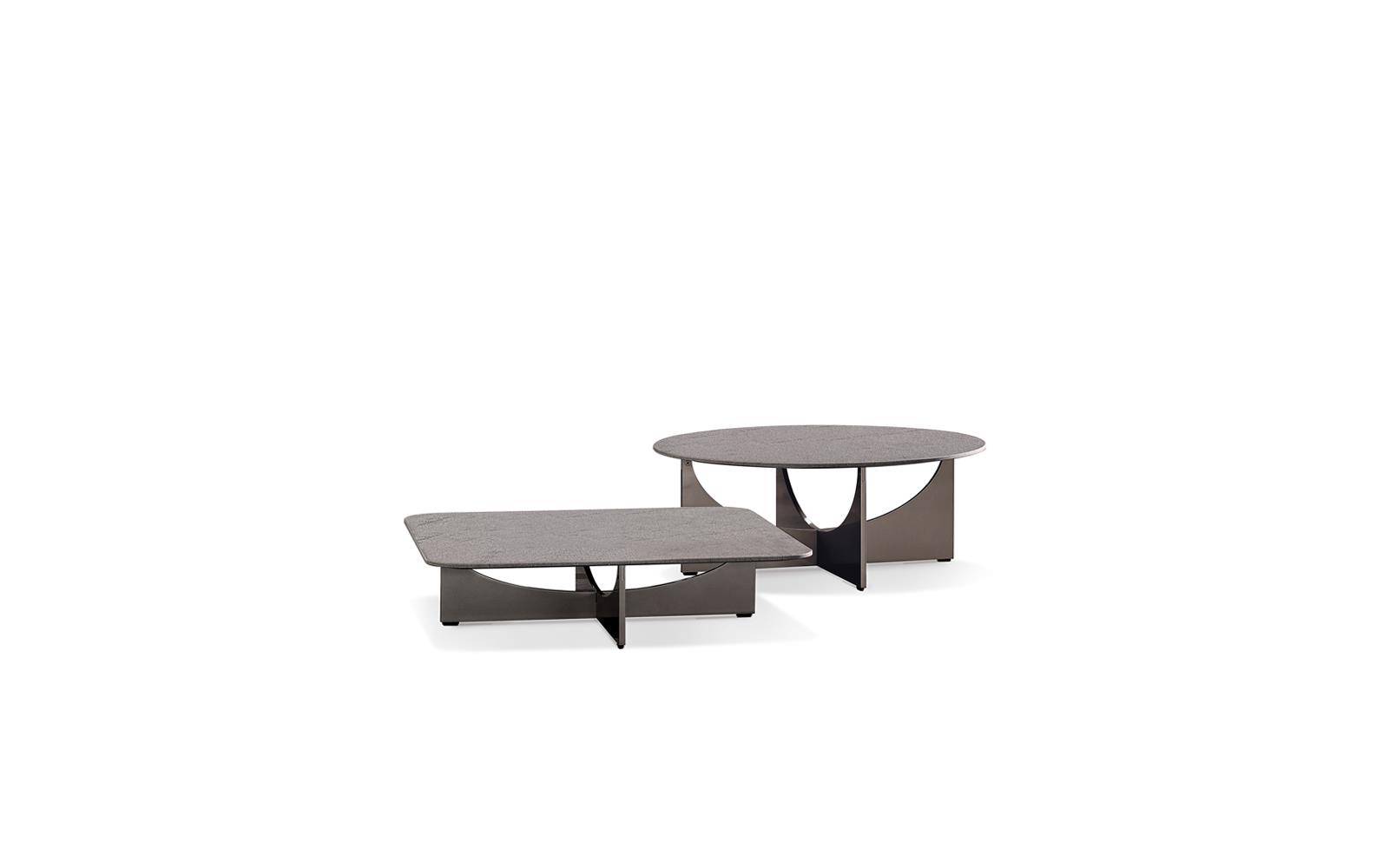 The coffee tables come in four sizes and two heights, with circular or square top in brushed, fine-grain Basaltina stone, which rests on the nest-shaped base